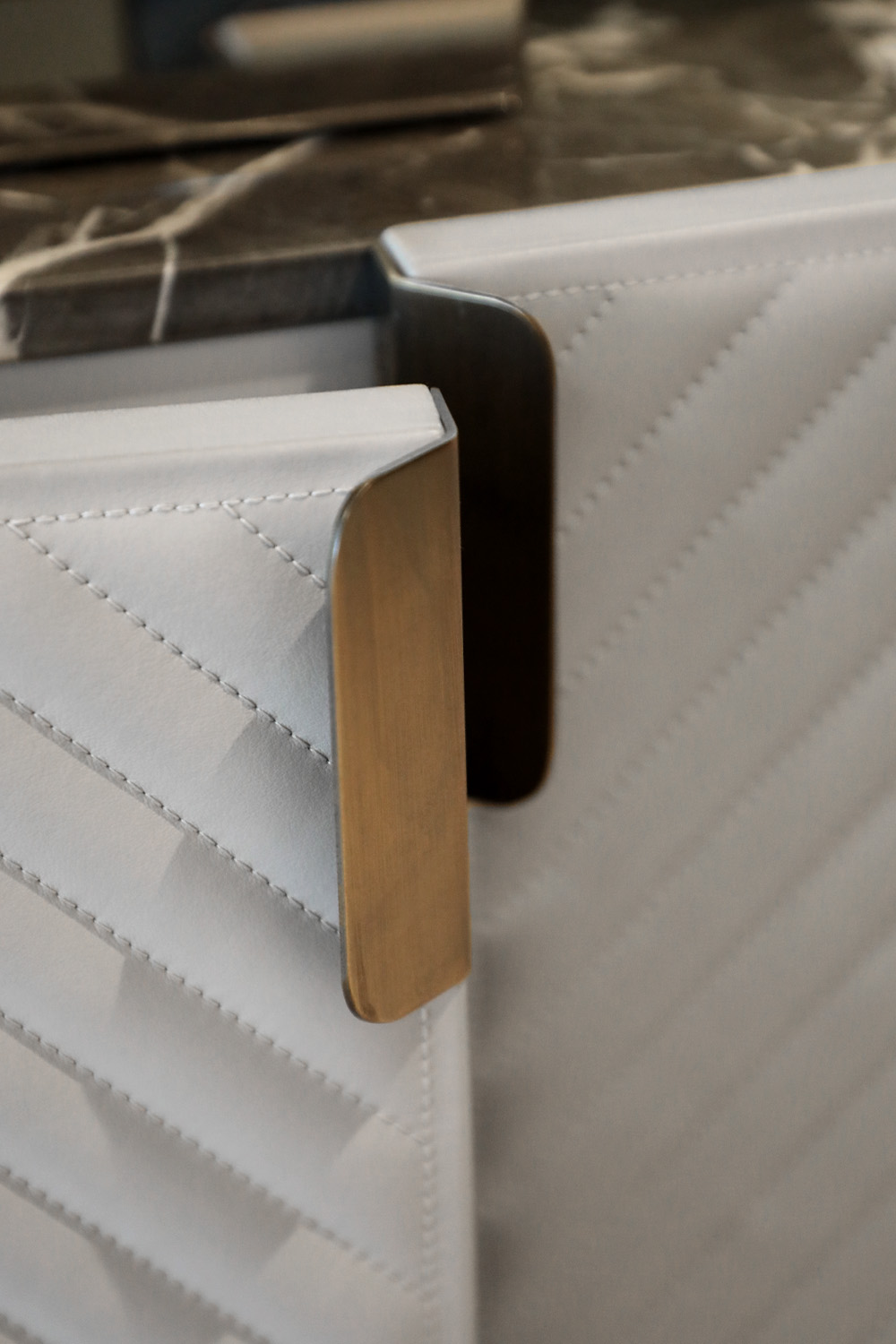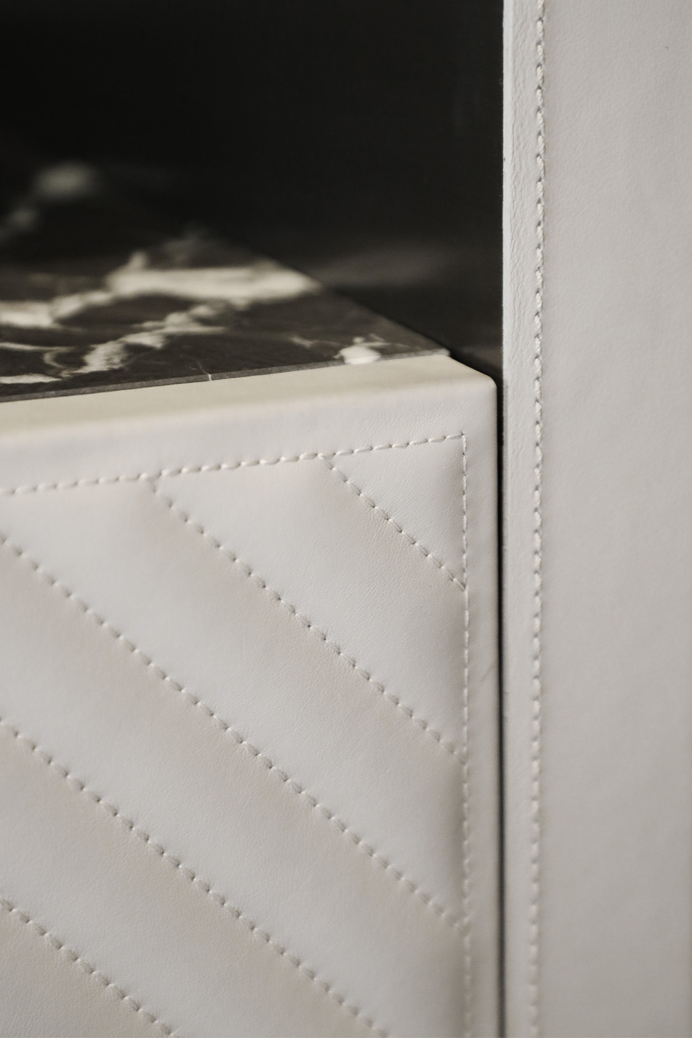 Sideboard with bronze details. Structure upholstered in leather and doors with sitiching. Top in marble with back lighting.