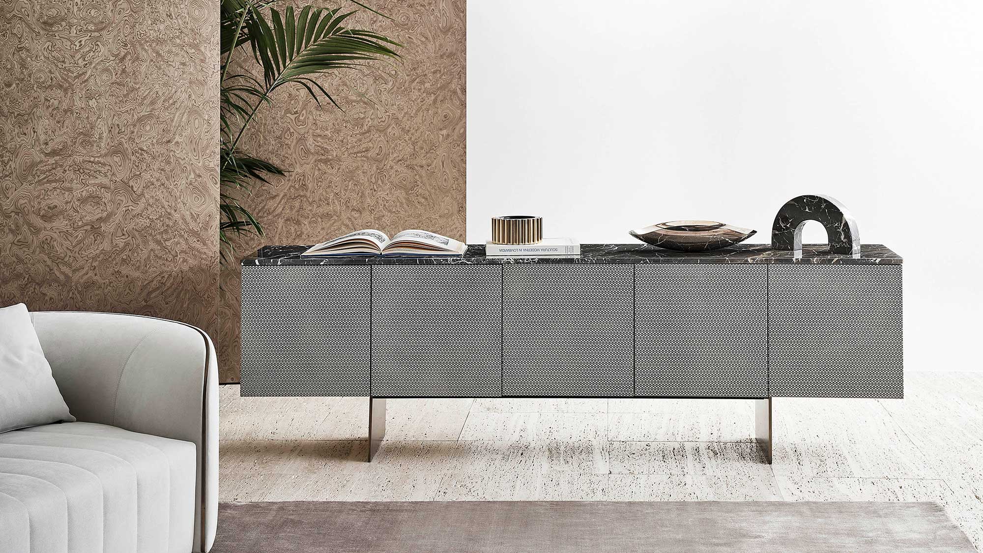 Sideboard range. Structure and doors upholstered in leather, marble top.