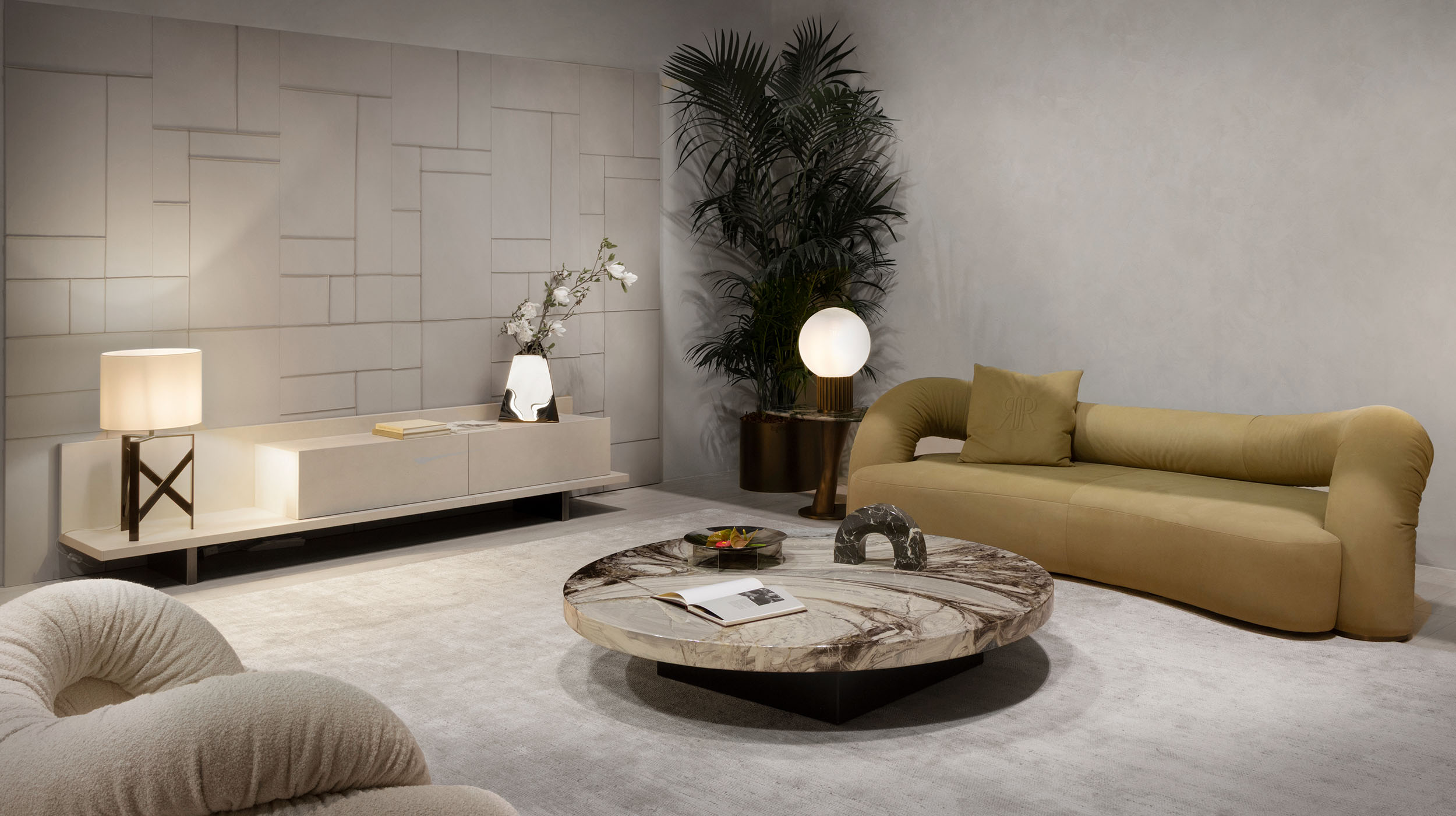 A textured finish playing with beige, sand, and dove-grey tones. It stands out for its linear and blended strokes following an organic direction, ideal for pairing with warm materials.