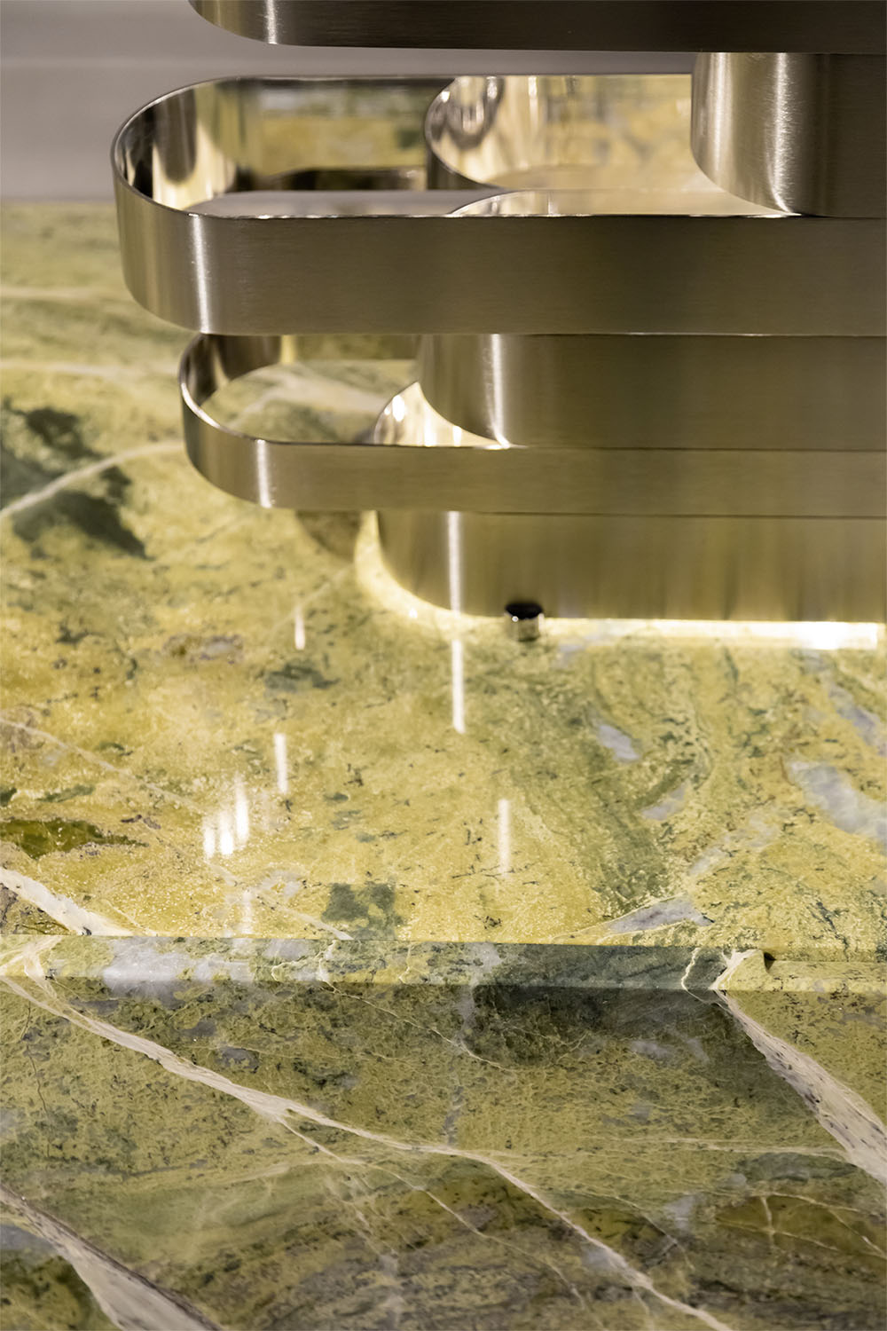A bold marble with fluid green and grey layering. It transforms the table top into a dynamic natural element of high decorative value.