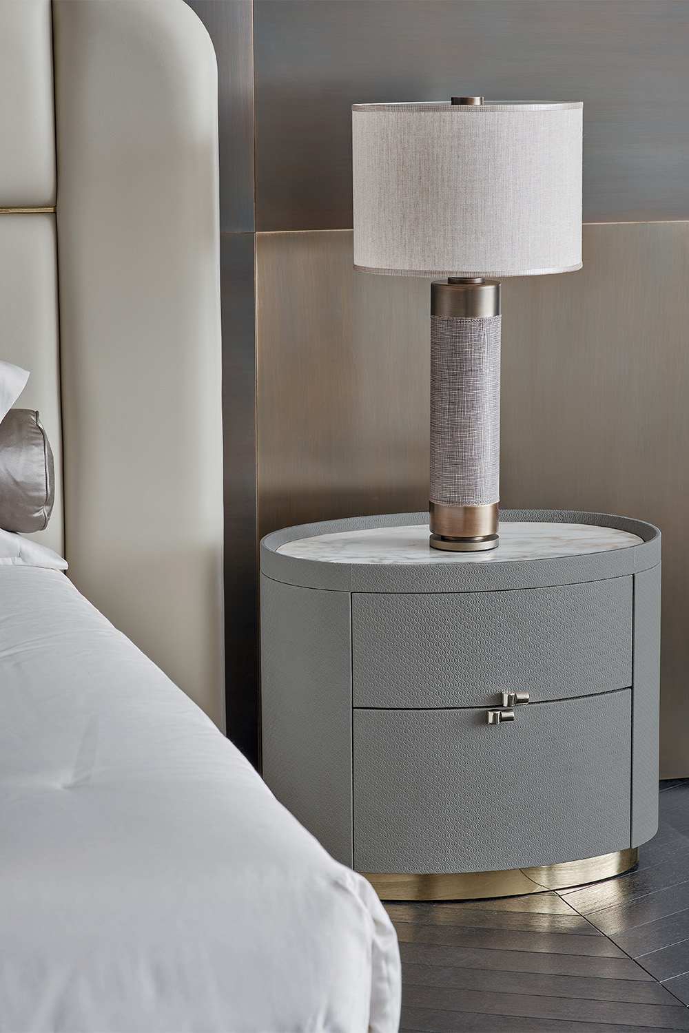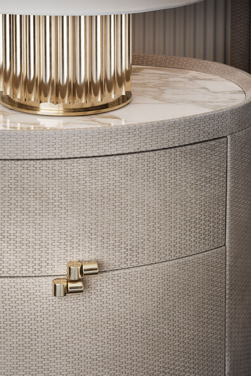 Soft lines and an oval silhouette define a bedside table with a discreet yet distinctive elegance. Fully upholstered in leather, the volume enhances the richness of its textures, transforming the surface into a refined material presence. The marble top adds a precious accent, completing a composition grounded in balance and sophistication.