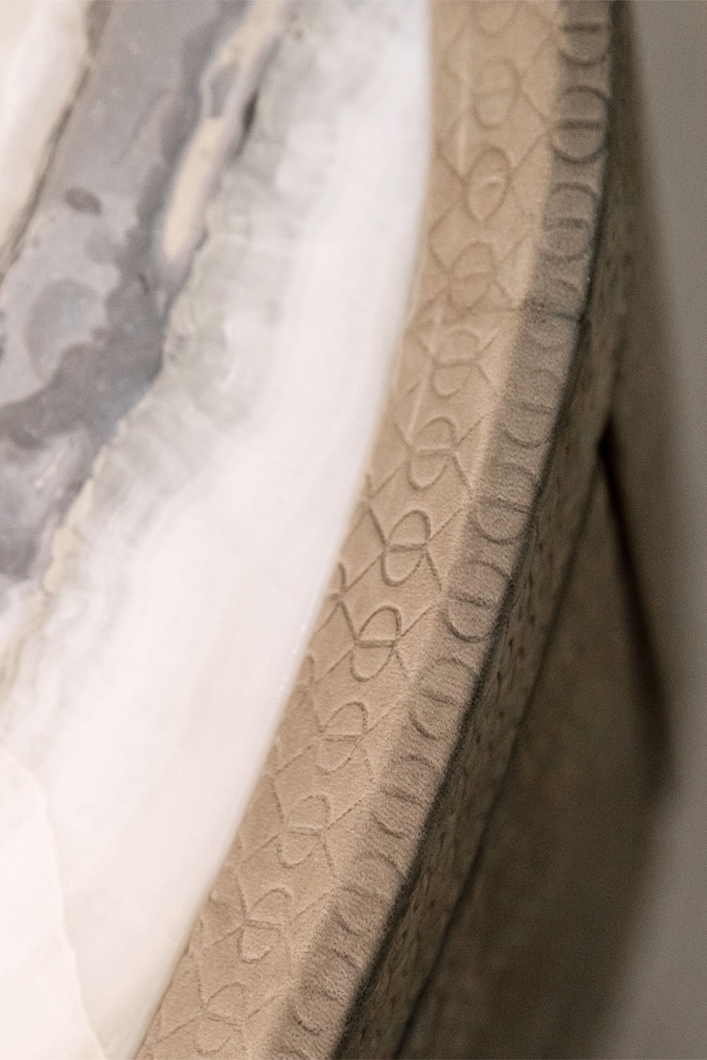Translucent clouded texture with cream and grey accents. It offers a unique visual depth that enhances the brightness of the top and its surroundings.