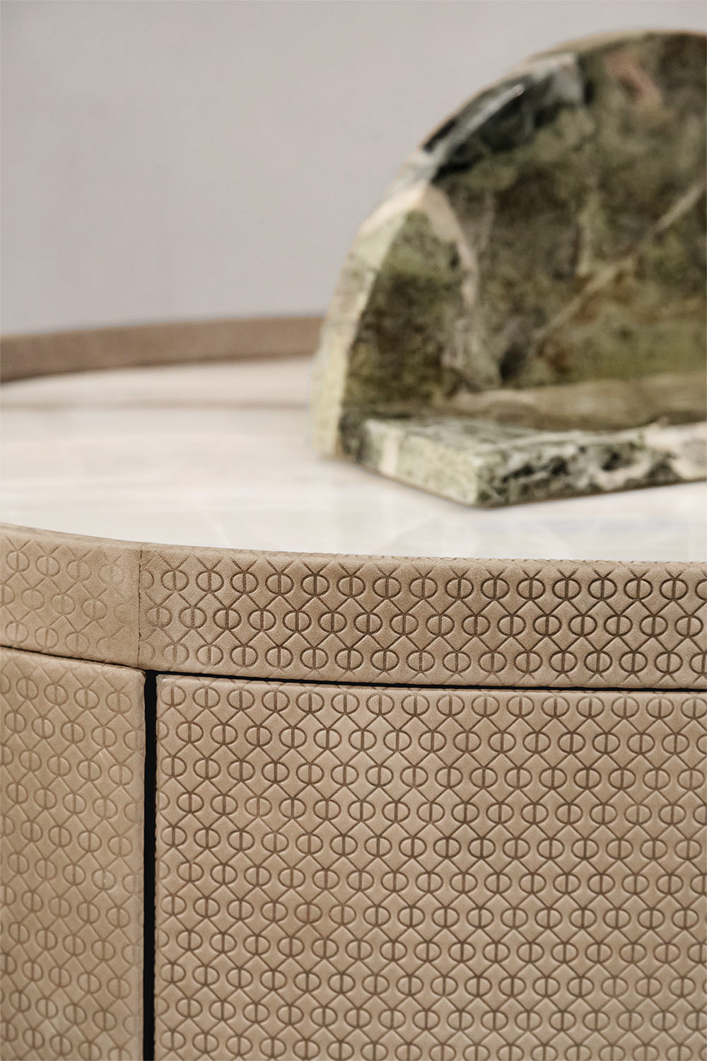 The marble top introduces a luminous, precious note, enriching the composition with a refined material contrast. The polished brass handles, discreet yet distinctive, function as jewel-like accents enhancing the three front drawers. The harmony between leather, metal, and natural stone creates a sophisticated balance in which every detail contributes to the piece’s identity.