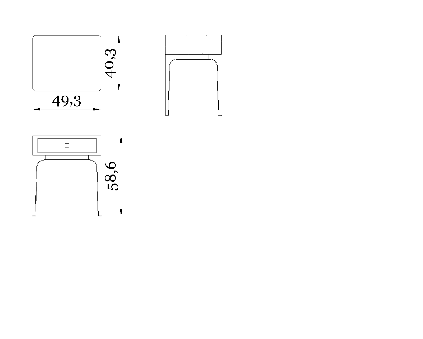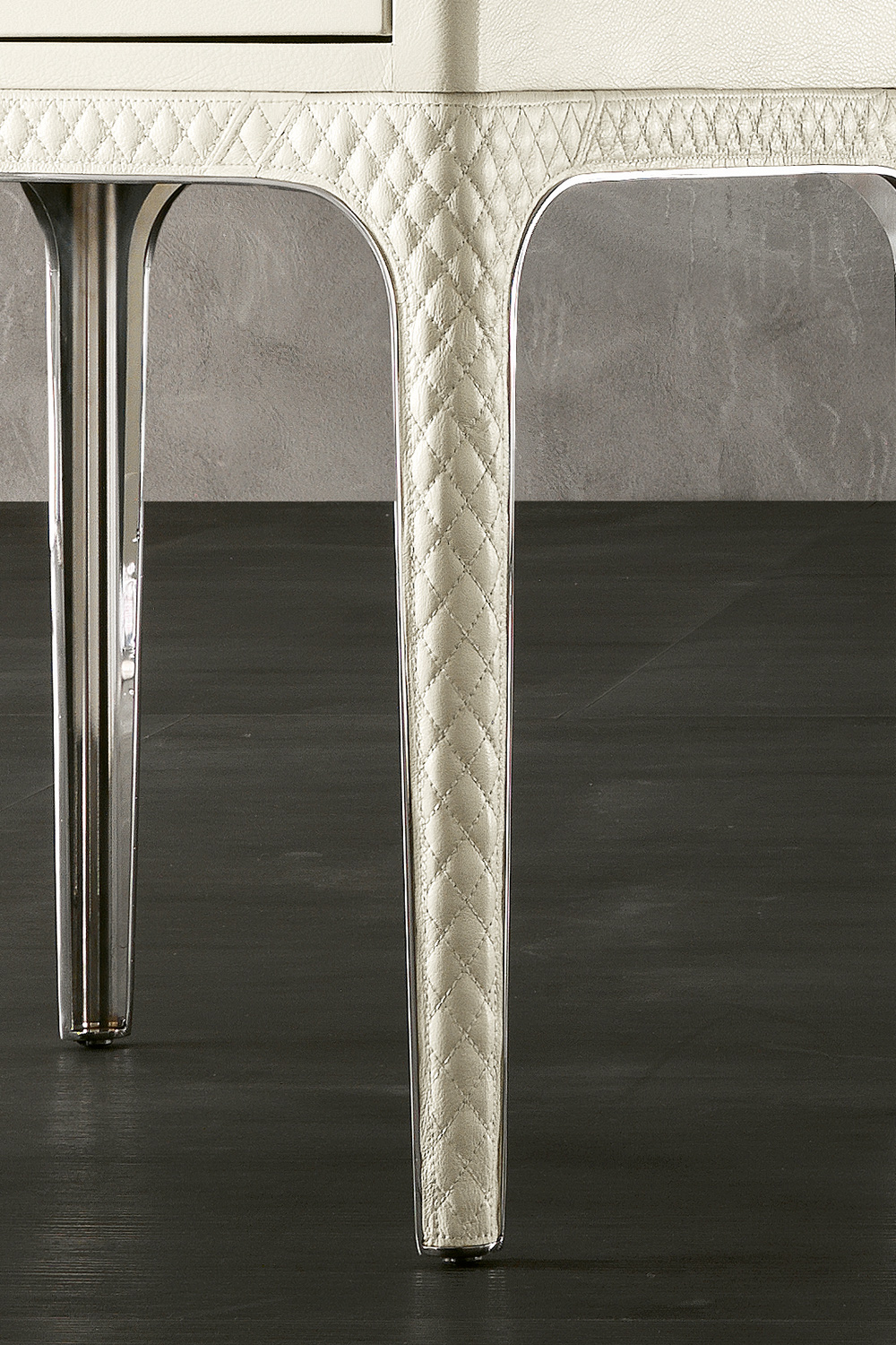 The base and legs, slender and sophisticated, reveal a delicate profile that combines metallic accents with leather upholstery, creating an elegant visual rhythm consistent with the overall design. The single drawer, seamlessly integrated into the structure, offers functionality without interrupting the continuity of the surfaces. A small geometric handle in polished metal completes the piece as a refined decorative element.