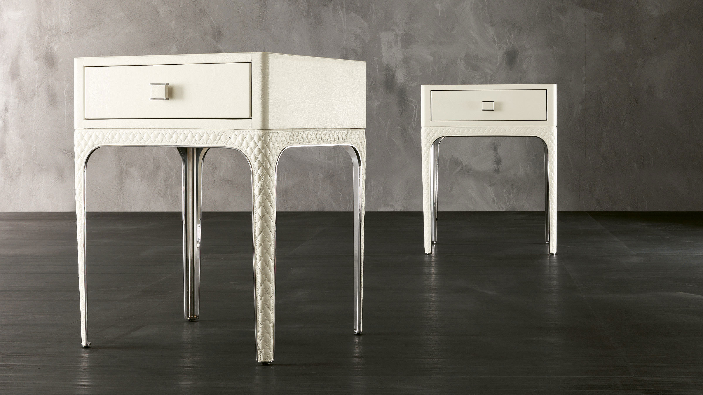 The Charlie bedside table interprets the purity of form through a compact volume entirely upholstered in leather, enhanced by a subtle matelassé pattern that highlights its artisanal character. Soft surfaces and a continuous perimeter line convey a sense of refined simplicity, while the contemporary design language makes it ideal for exclusive bedroom settings. The balance between proportions and visual lightness defines a discreet piece with a strong and distinctive personality.
