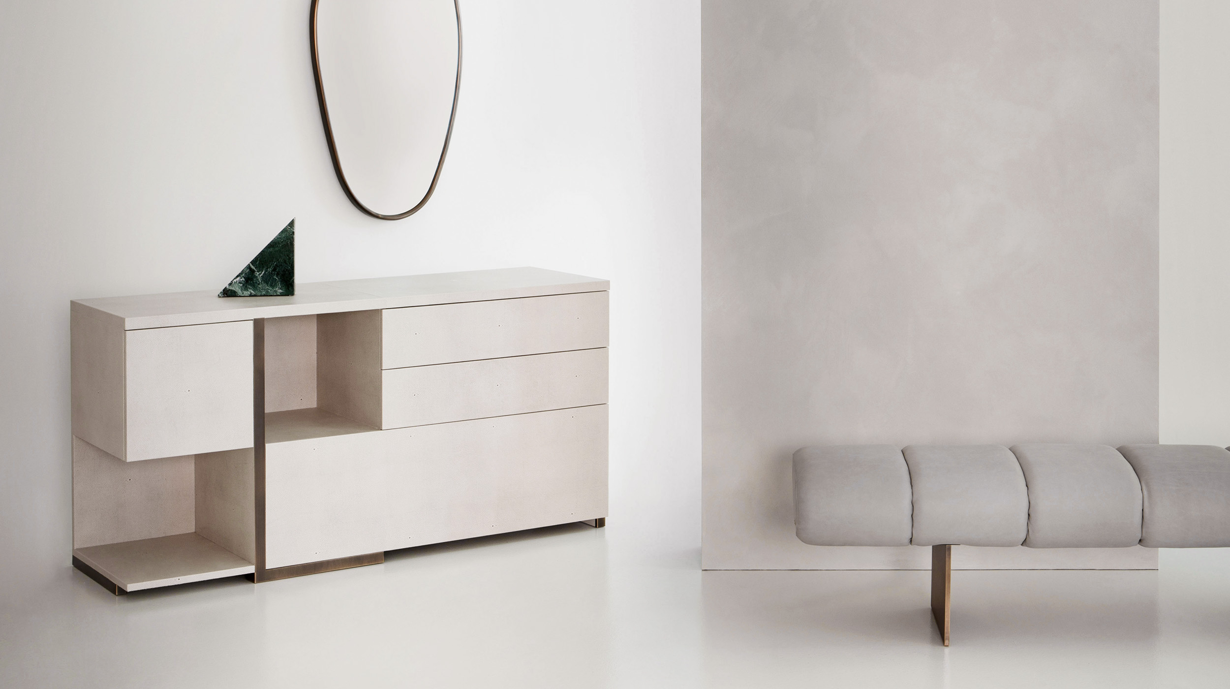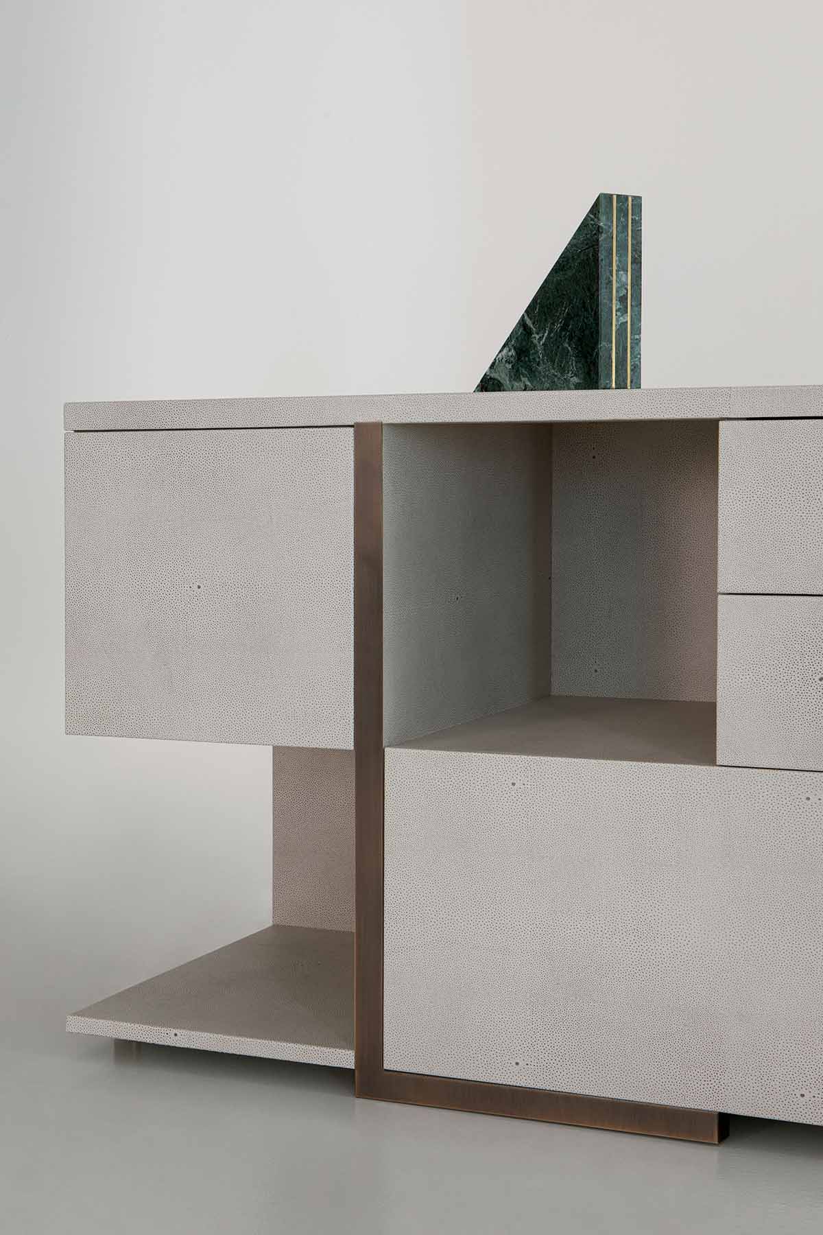 Defining the design is the vertical bronzed-brass insert, a structural line that crosses the piece and organizes its composition. This metallic detail—both luminous and assertive—creates dialogue between the various levels, introducing a refined contrast of materials and emphasizing the architectural nature of the design. Its presence becomes an aesthetic signature, adding depth and identity through a gesture that is subtle yet distinctive.