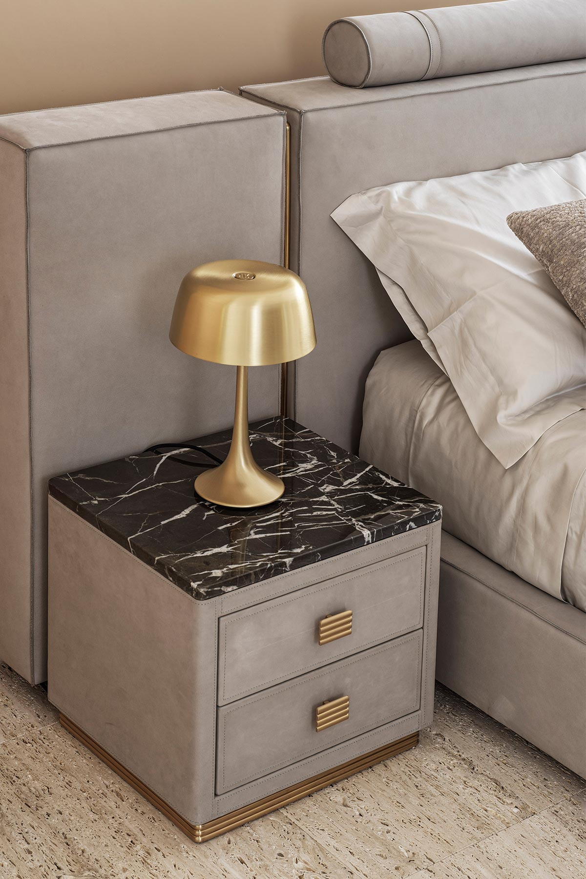 The Rubik nightstand interprets the essence of a clean, sculptural volume with a contemporary and elegant attitude. Its leather-clad surfaces enhance both the precision of the lines and the tactile softness of the material, while the marble top introduces a luminous, sculptural presence. The compact structure conveys solidity and visual harmony, making it a piece with strong aesthetic impact.