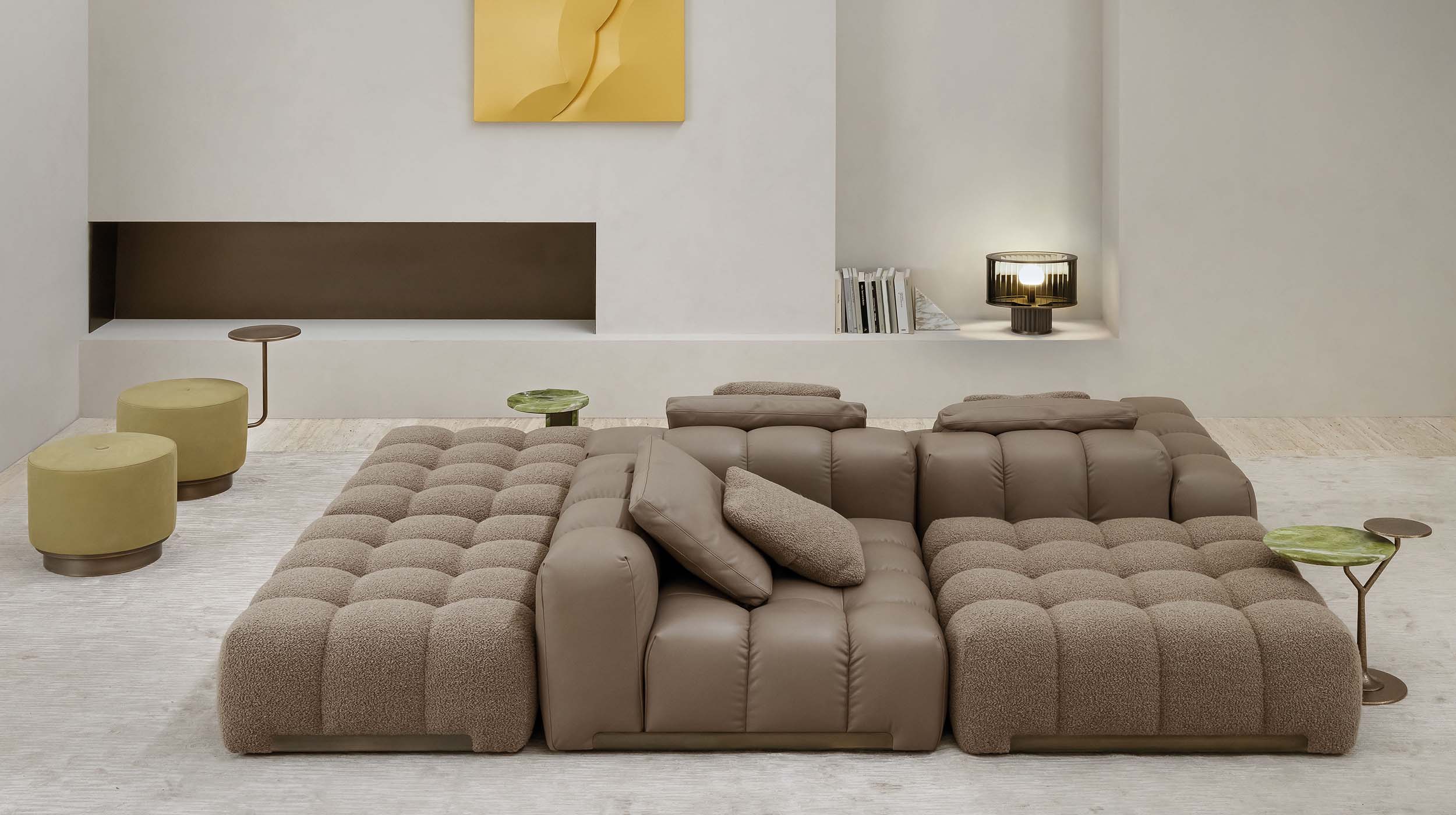 Three-dimensionality, craftsmanship, formal rigor. The Texture & Strutturati volume explores the architectural dimension of fabric. This book brings together a wide range of refined weaves, characterized by the use of heavy yarns that create decorative patterns with a strong visual impact. The weave becomes the protagonist: every warp is designed to enhance the structure of Rugiano furniture, adding depth and character to the surfaces. These are "living" fabrics, capable of interacting with light and defining space through a play of thickness and discreet yet bold geometric designs, perfect for premier residential projects.