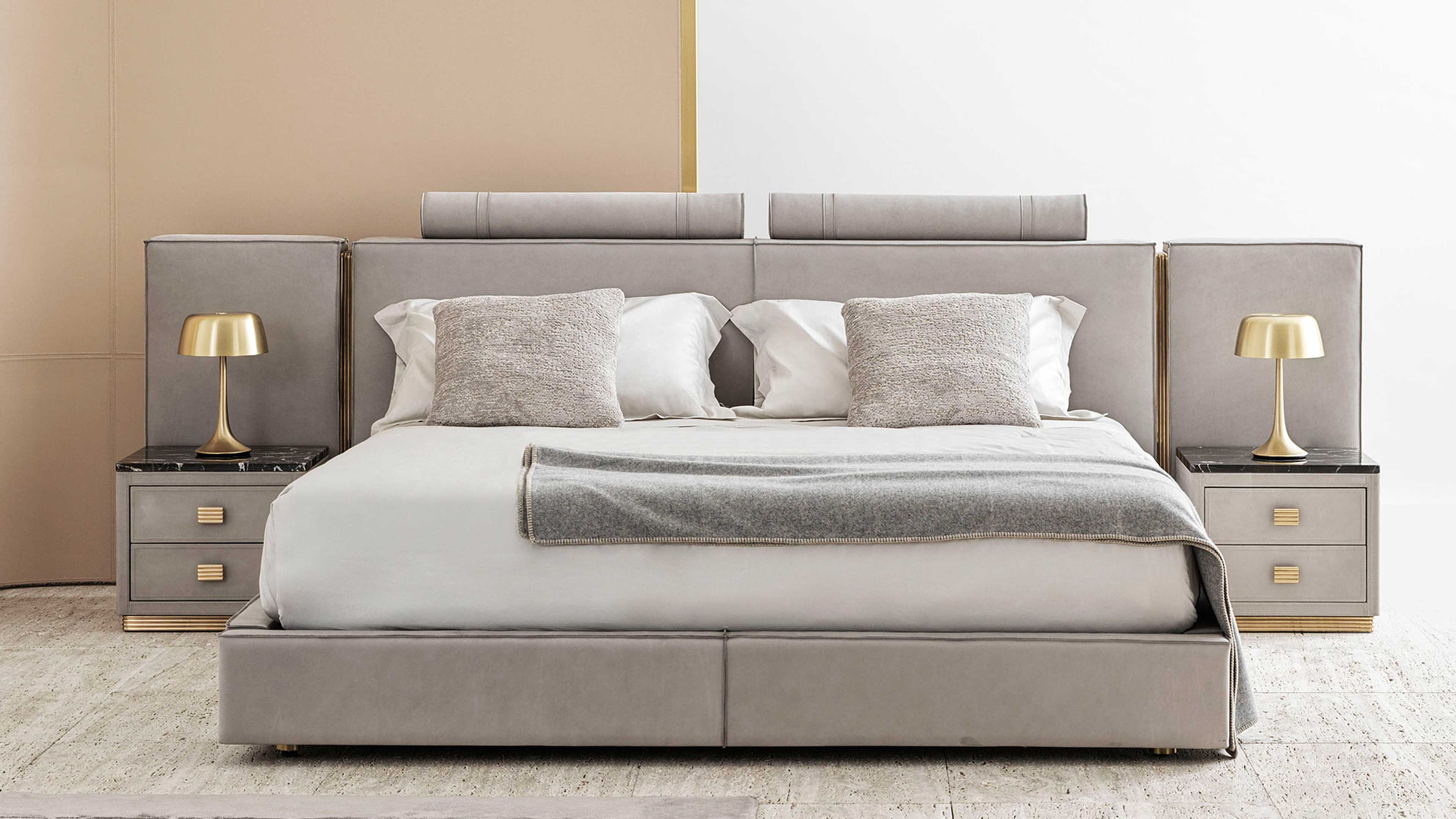 Range of 2 or 3 drawers bedside tables available in two different dimensions, upholstered in leather. Marble top and metal detailing.