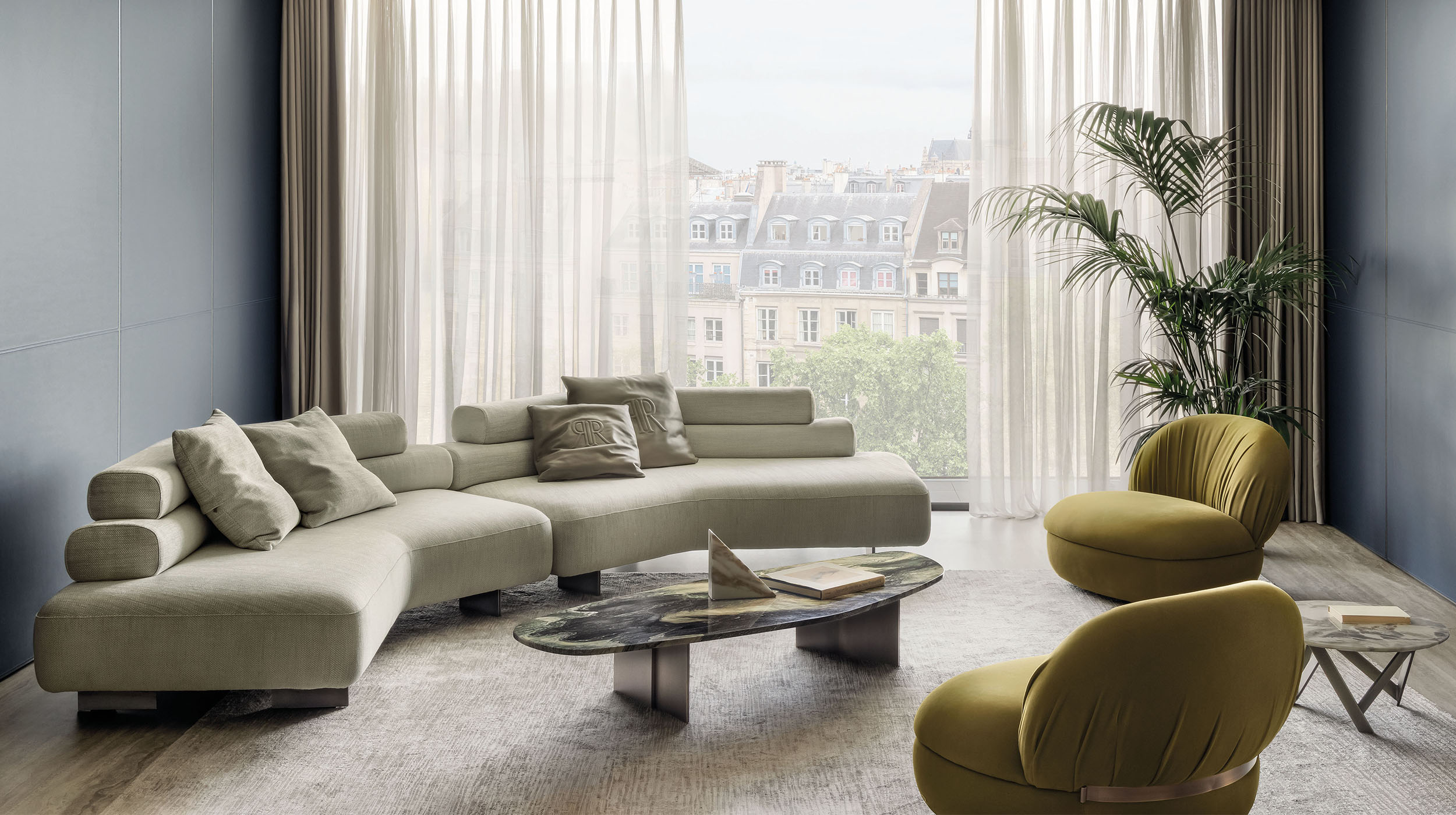 Extreme softness, noble yarns, natural luster. The first chapter of the collection, Velvet & Chenille, is a tribute to the nobility of natural fibers. Within this book, Rugiano’s research celebrates the classic elegance of cotton velvet, enriching it with ultra-luxury offerings in Cashmere and Alpaca—ideal for those seeking a sensation of absolute comfort and enveloping warmth. The chenilles, crafted from natural cotton and viscose yarns, offer shimmering reflections and a soft hand, while ensuring ideal durability for sophisticated daily use. A selection designed for environments that make the preciousness of materials their distinctive hallmark.