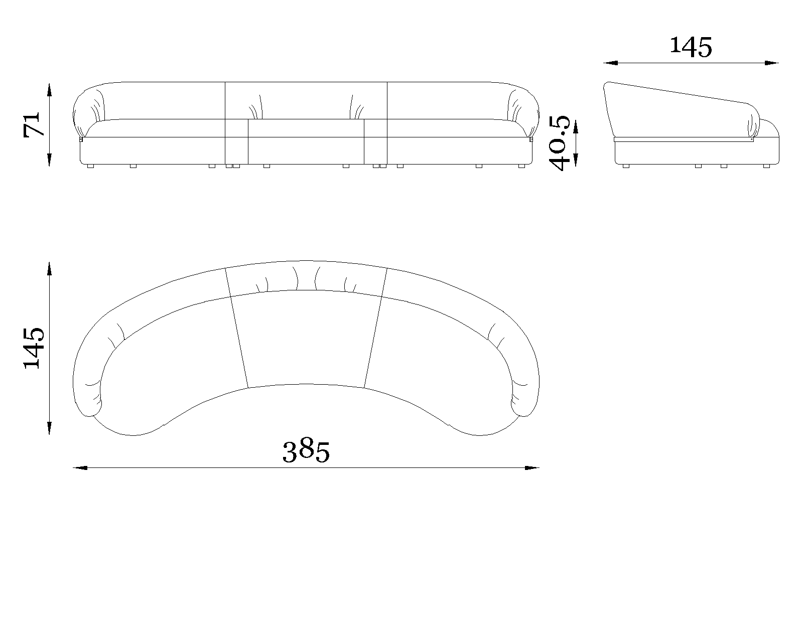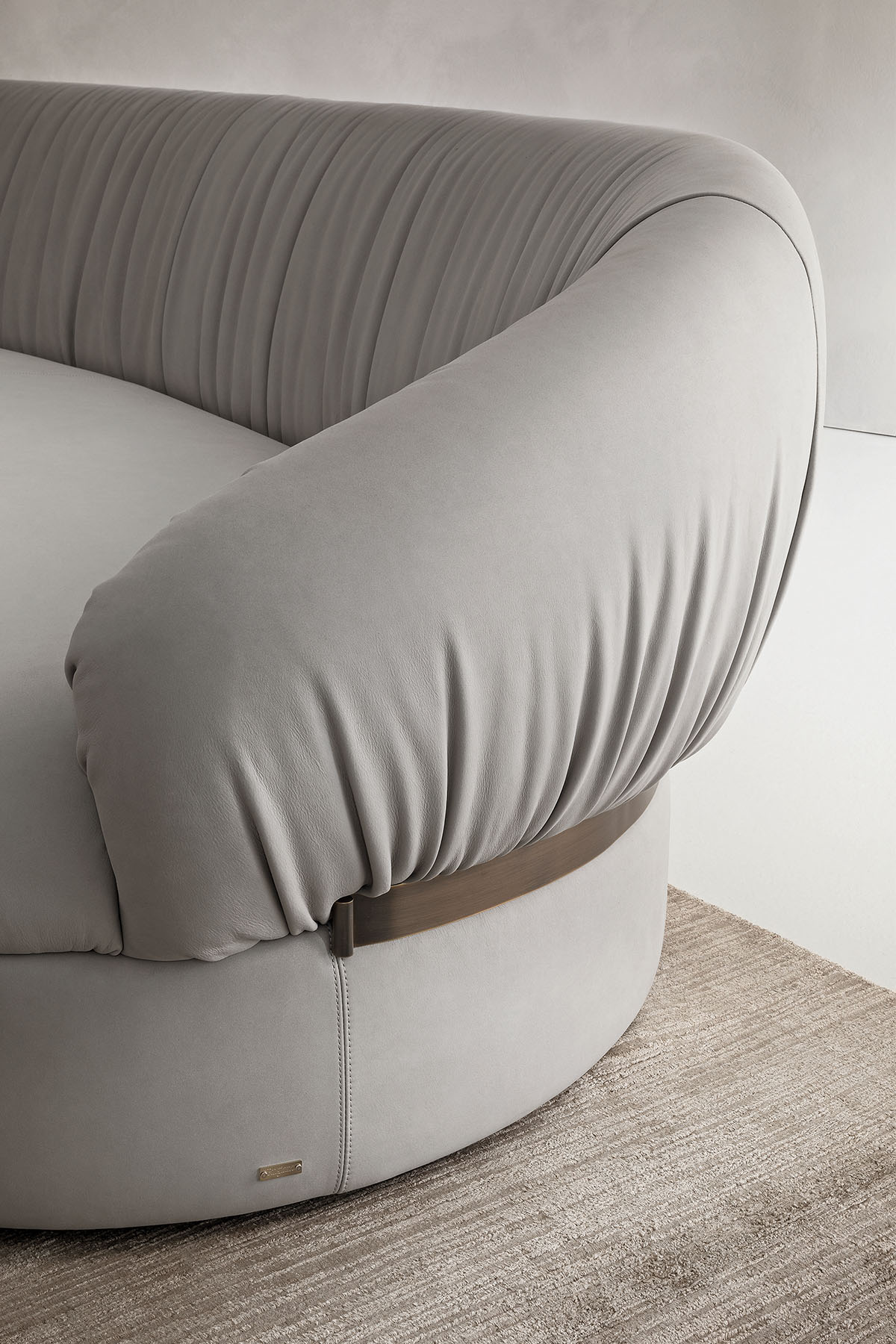 The Fandango sofa interprets comfort through generous curves and a fluid silhouette, designed to welcome the body with a natural sense of ease. Its continuous, enveloping backrest embraces the seat in a single harmonious gesture, while the softly upholstered volumes create a reassuring presence that remains light and refined. Subtle vertical draping adds rhythm and depth, recalling a tailored approach that gives the piece personality without excess.