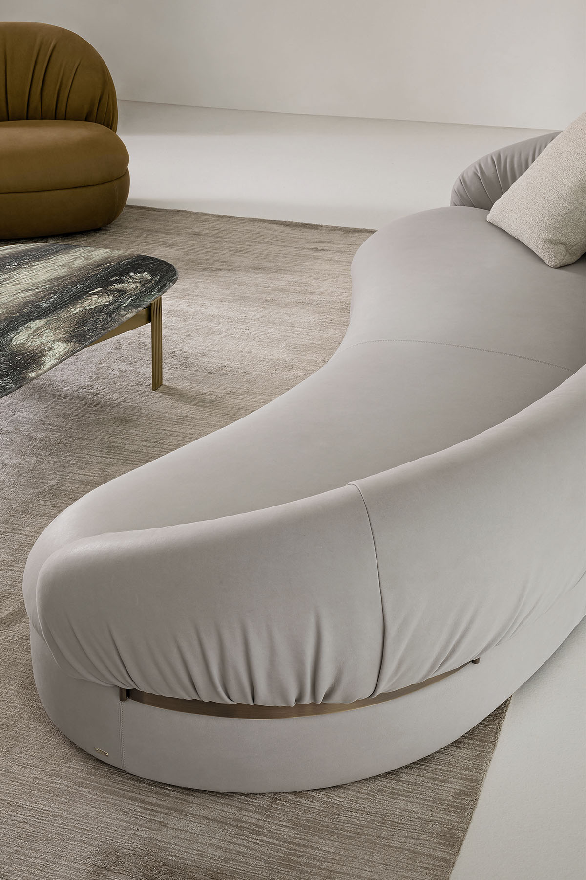 The rounded base enhances the sofa’s compact, sculptural identity, emphasizing the balance between softness and architectural clarity. Every detail is calibrated to express a relaxed sophistication: the seamless proportions, the gentle transitions between elements, and the elegant continuity of the upholstery. Fandango becomes an understated focal point, able to define the space through its quiet strength and its inviting tactility.