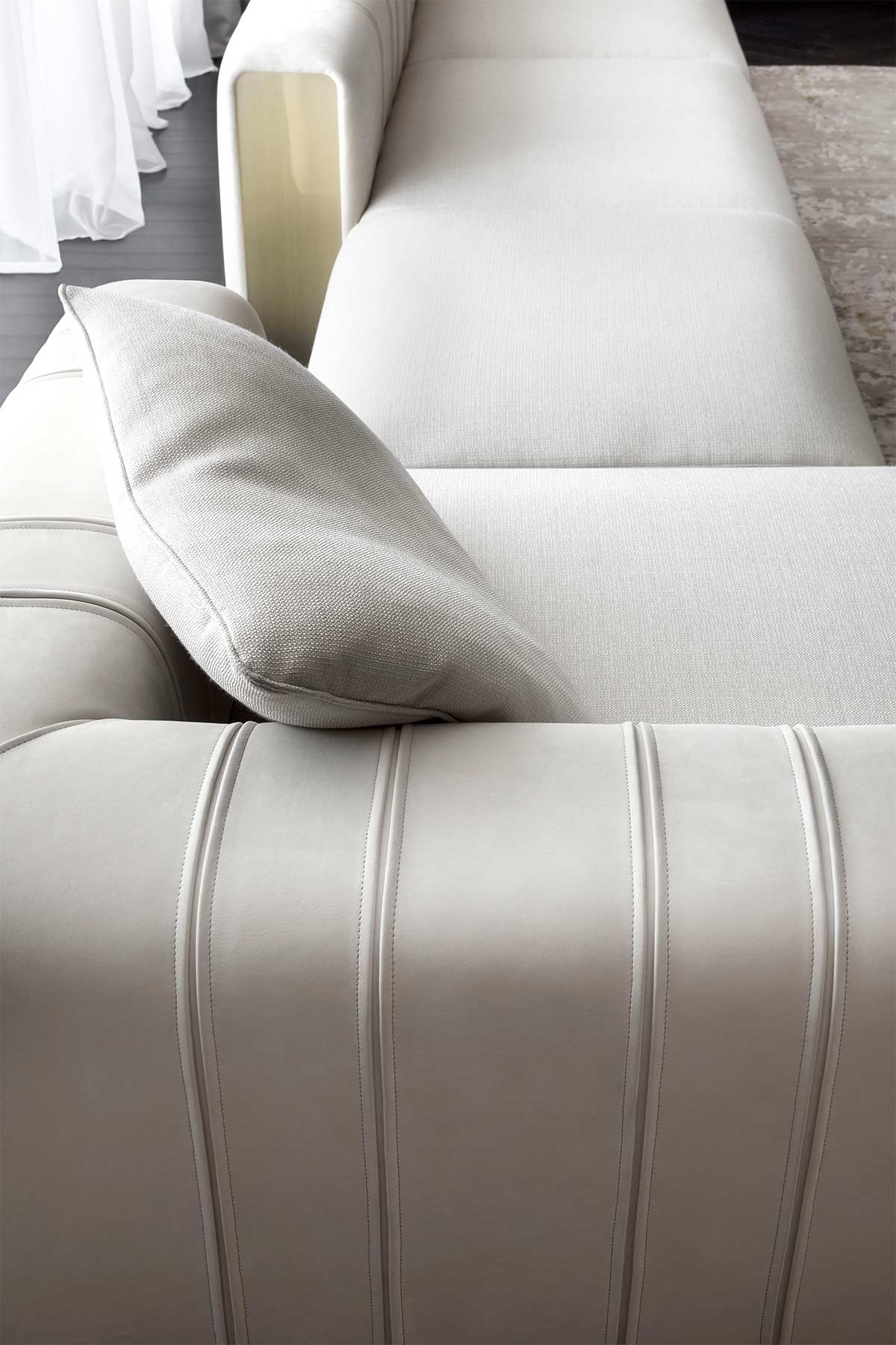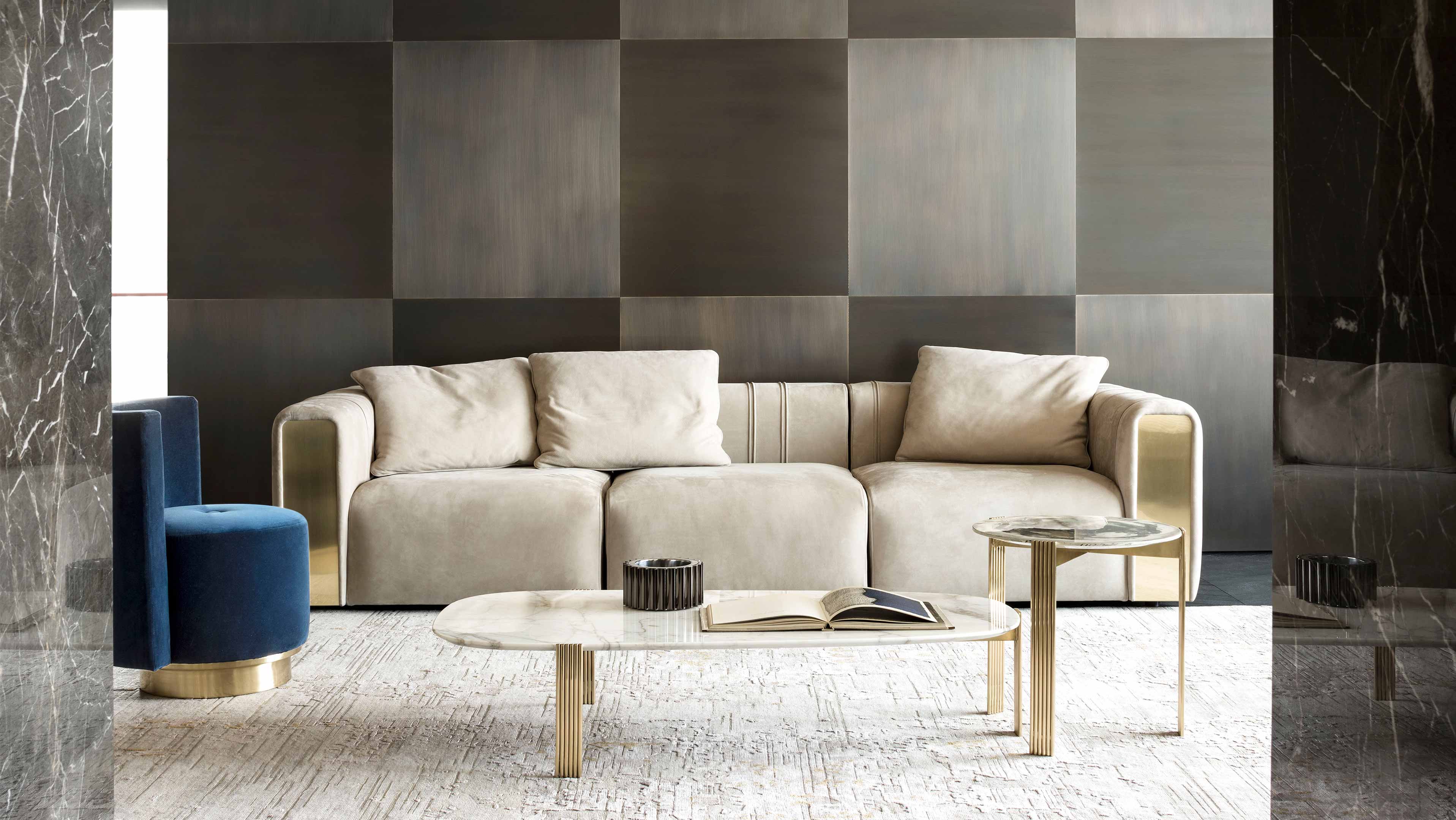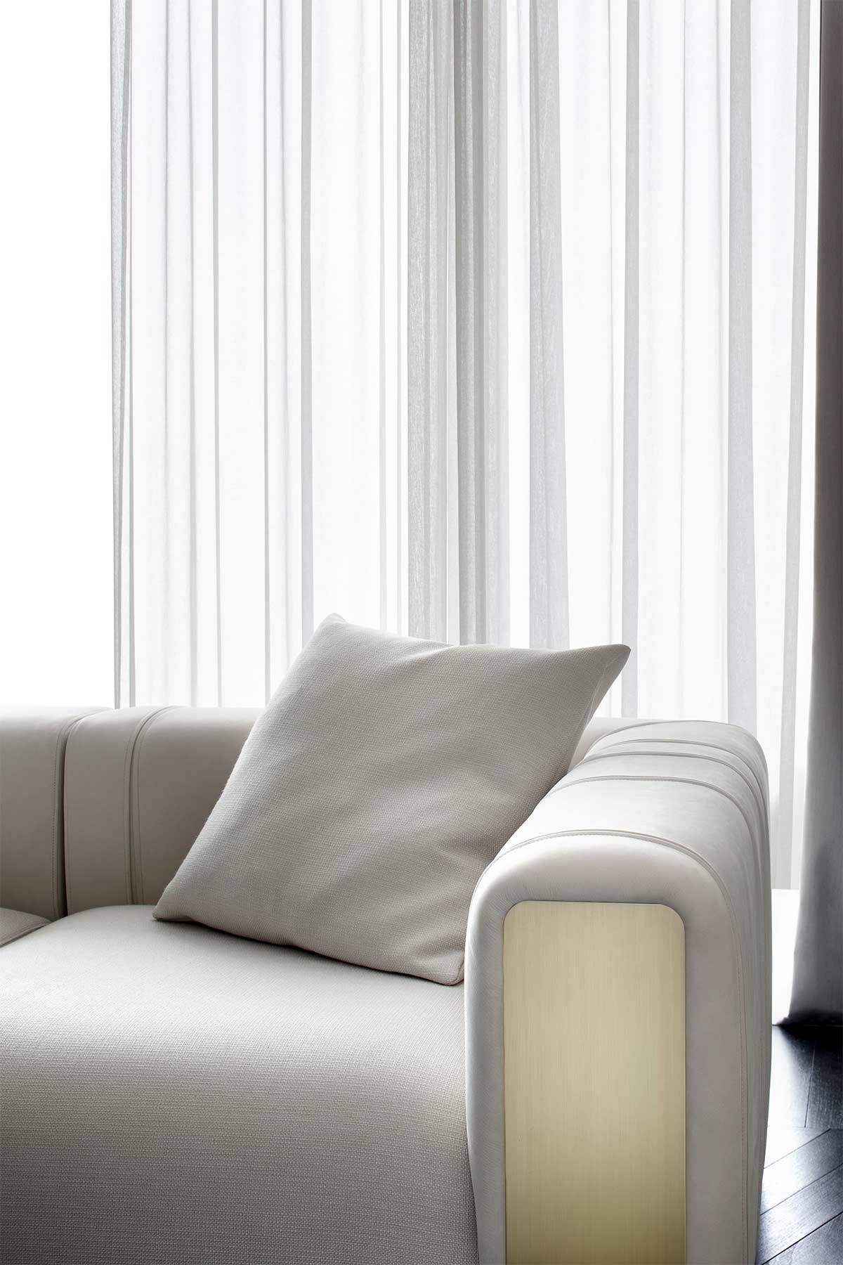 A range of upholstered furniture characterised by a brushed brass detail on the armrests and a serie of harmoniously-disposed pliss on the backrest.