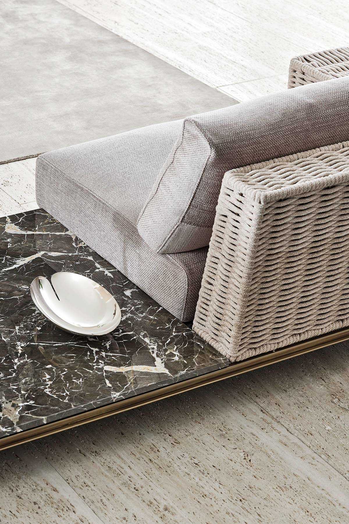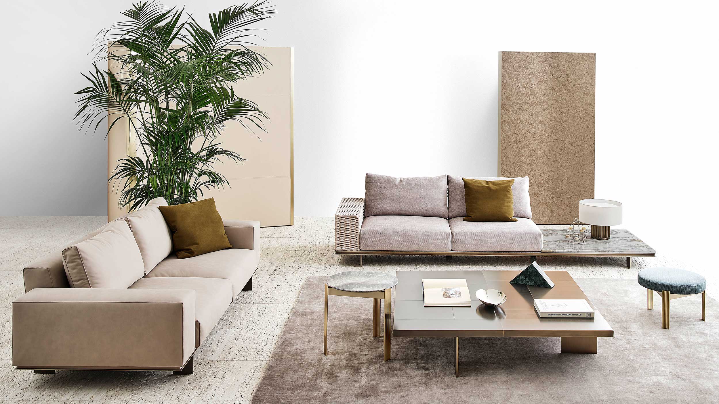 The Memphis collection, is characterized by a linear metal base, with extremely elegant lines and leather details for versions covered in leather. The base with marble coffee tables allows the creation of different compositions.