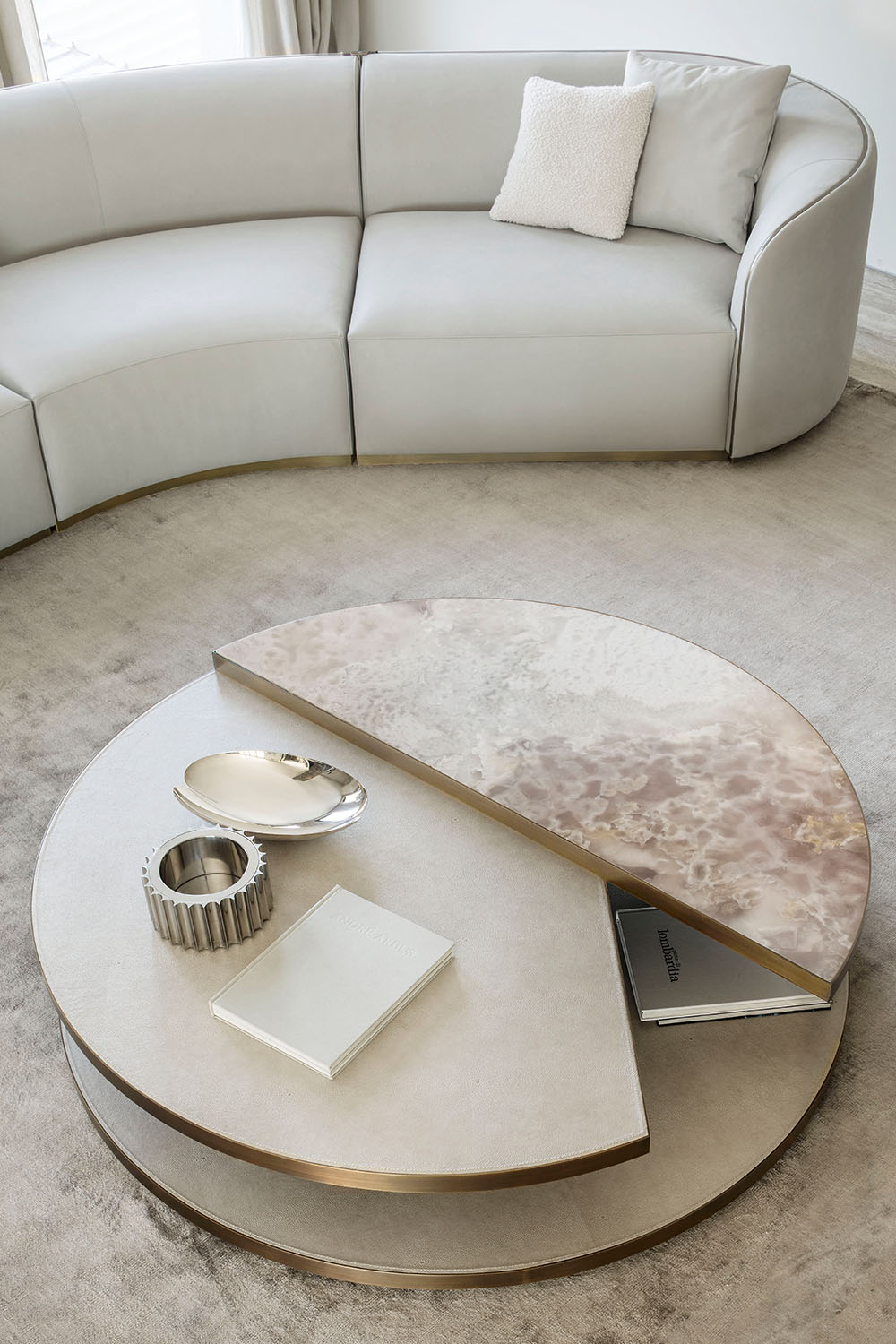 Three-dimensionality, craftsmanship, formal rigor. The Texture & Strutturati volume explores the architectural dimension of fabric. This book brings together a wide range of refined weaves, characterized by the use of heavy yarns that create decorative patterns with a strong visual impact. The weave becomes the protagonist: every warp is designed to enhance the structure of Rugiano furniture, adding depth and character to the surfaces. These are "living" fabrics, capable of interacting with light and defining space through a play of thickness and discreet yet bold geometric designs, perfect for premier residential projects.