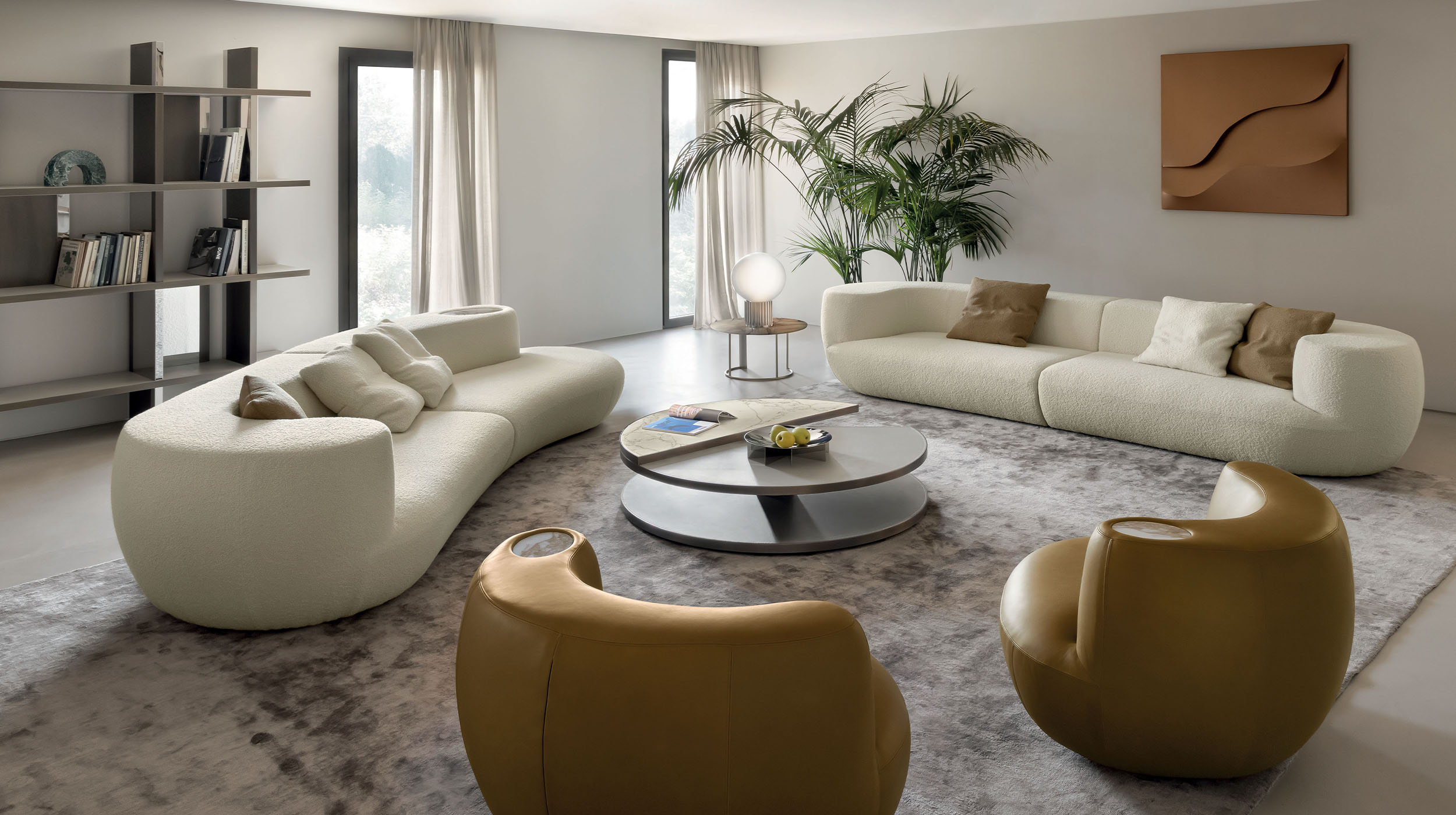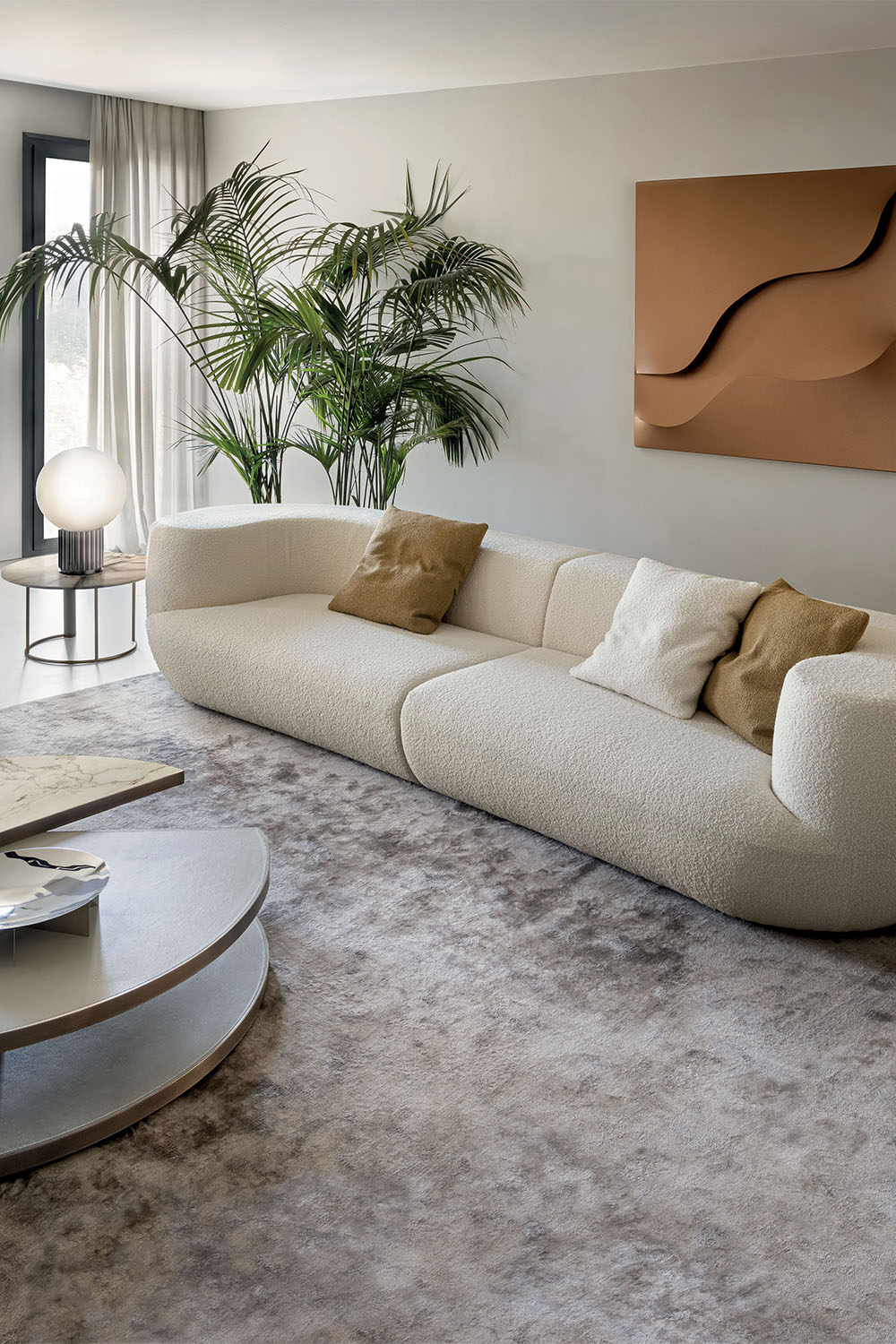 The Rafael sofa reimagines the concept of relaxation through sinuous shapes and generous volumes, designed to embrace the body naturally and define the space with a sculptural presence. Its curved, continuous lines interact harmoniously with the surrounding environment, creating a fluid and elegant composition—perfect for high-end living spaces.