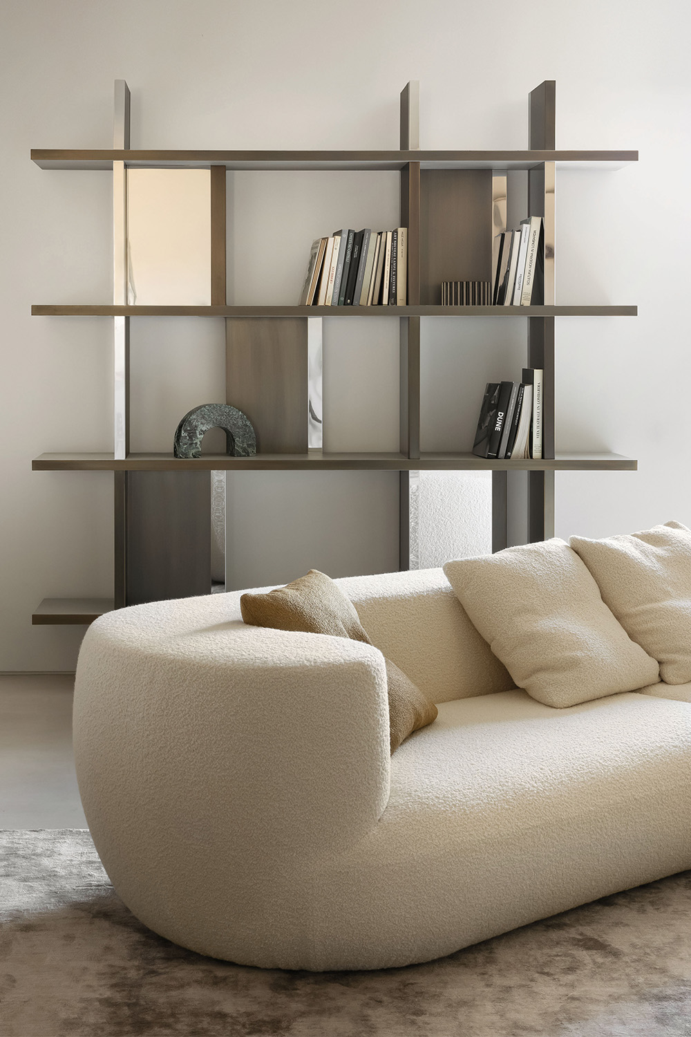 Offered in a two-piece modular version—left and right elements—Rafael allows for the creation of a spacious, monolithic seating arrangement that inhabits the room with understated sophistication. The enveloping design is enriched by refined details, such as the iconic natural marble insert set into the backrest: a distinctive gesture that elevates the material and makes each piece unique.
