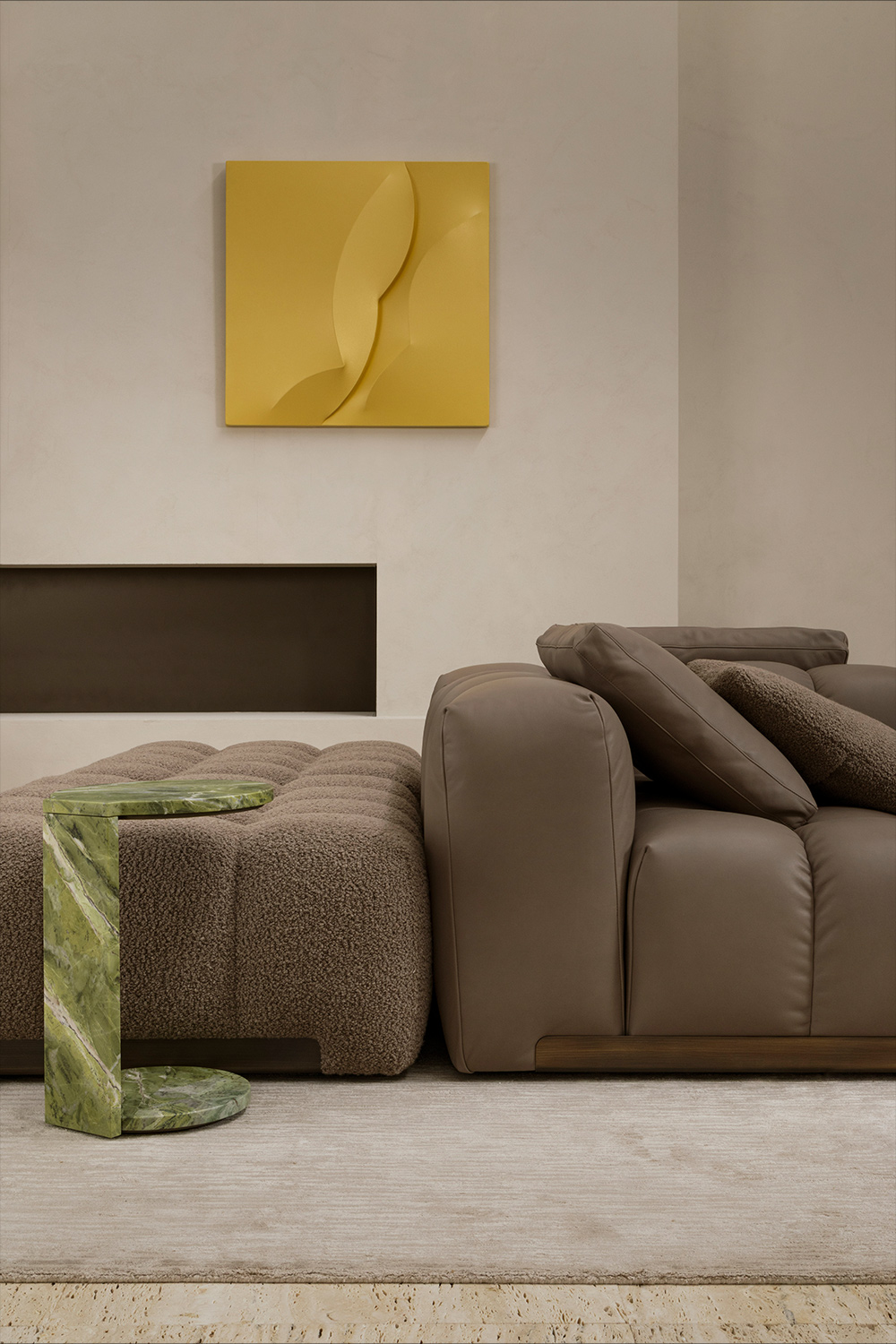 Extreme softness, noble yarns, natural luster. The first chapter of the collection, Velvet & Chenille, is a tribute to the nobility of natural fibers. Within this book, Rugiano’s research celebrates the classic elegance of cotton velvet, enriching it with ultra-luxury offerings in Cashmere and Alpaca—ideal for those seeking a sensation of absolute comfort and enveloping warmth. The chenilles, crafted from natural cotton and viscose yarns, offer shimmering reflections and a soft hand, while ensuring ideal durability for sophisticated daily use. A selection designed for environments that make the preciousness of materials their distinctive hallmark.