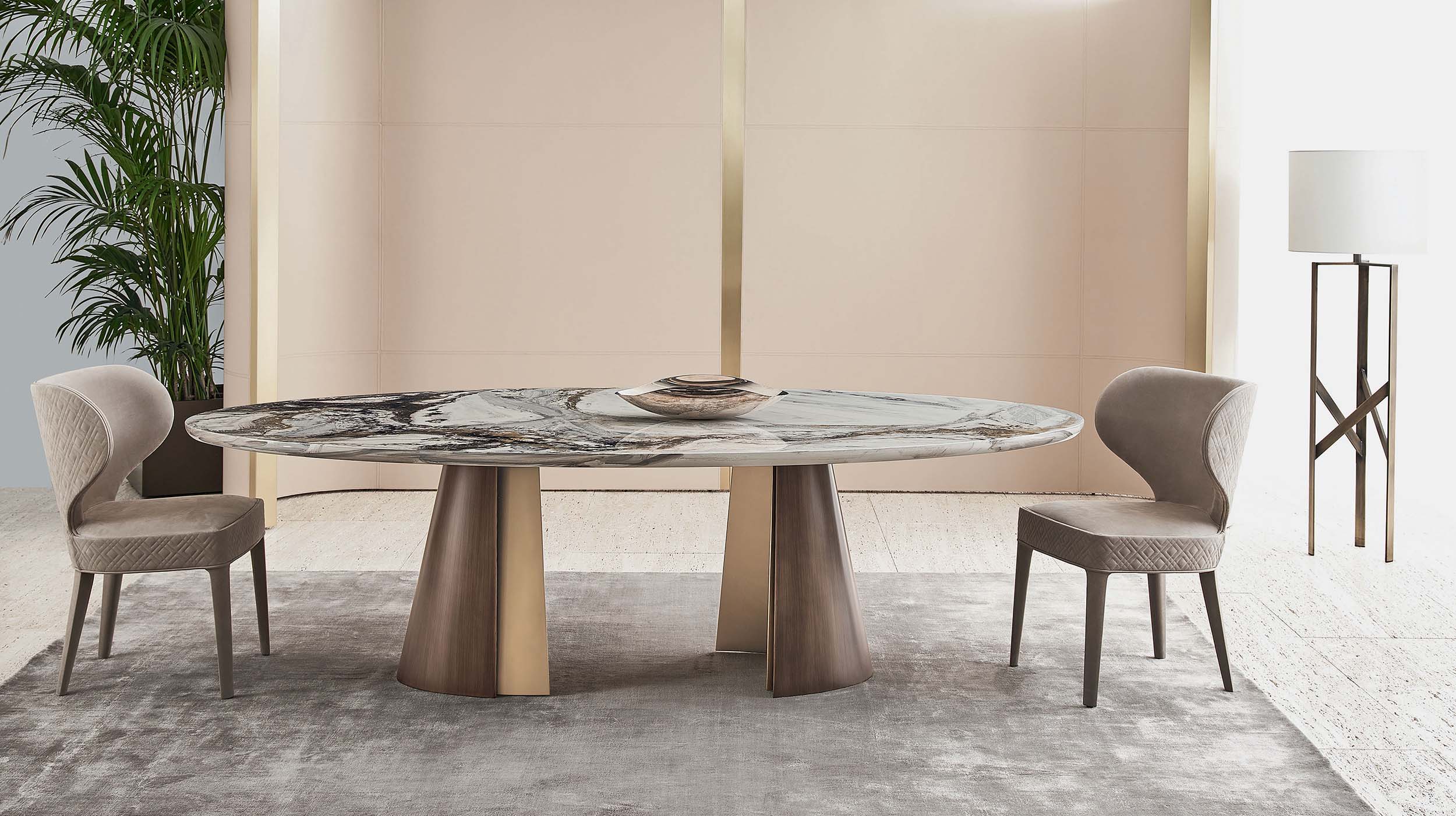 Dining Table with sculpturesque base characterised by the contrast between similar finishes, either bronze and gloss gold or black chrome and chromed steel. The top is available in a variety of dimensions and can be decorated or made out of wood or marble.