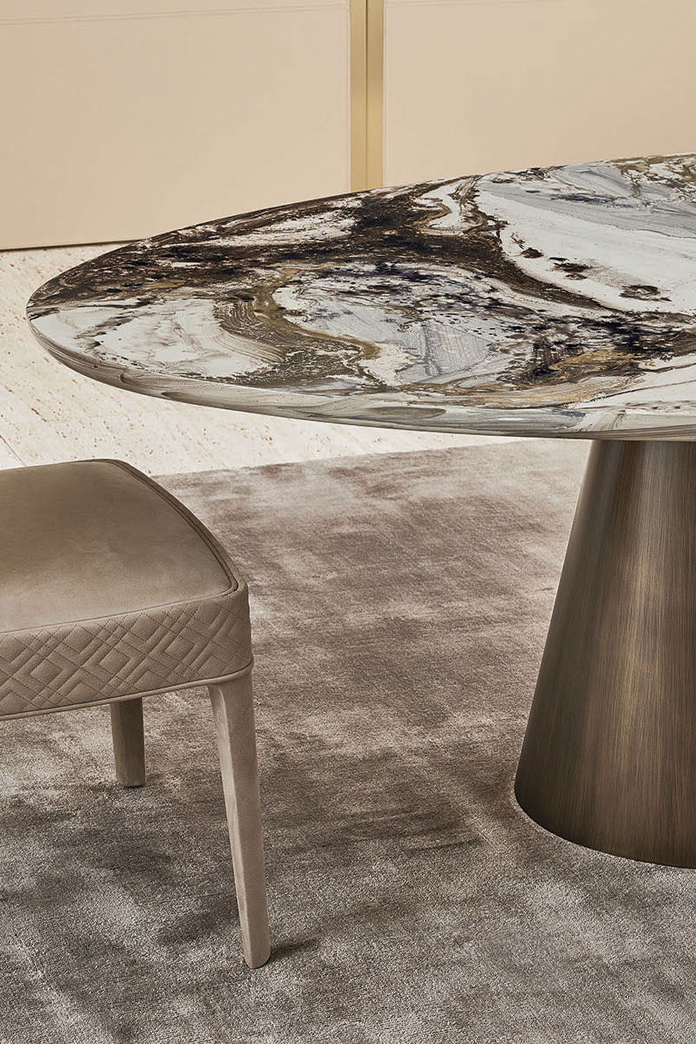 A brecciated marble with a creamy-white background and bold, spectacular veining in shades of purple and burgundy. It transforms the table into an iconic piece of furniture with a strong sculptural component.
