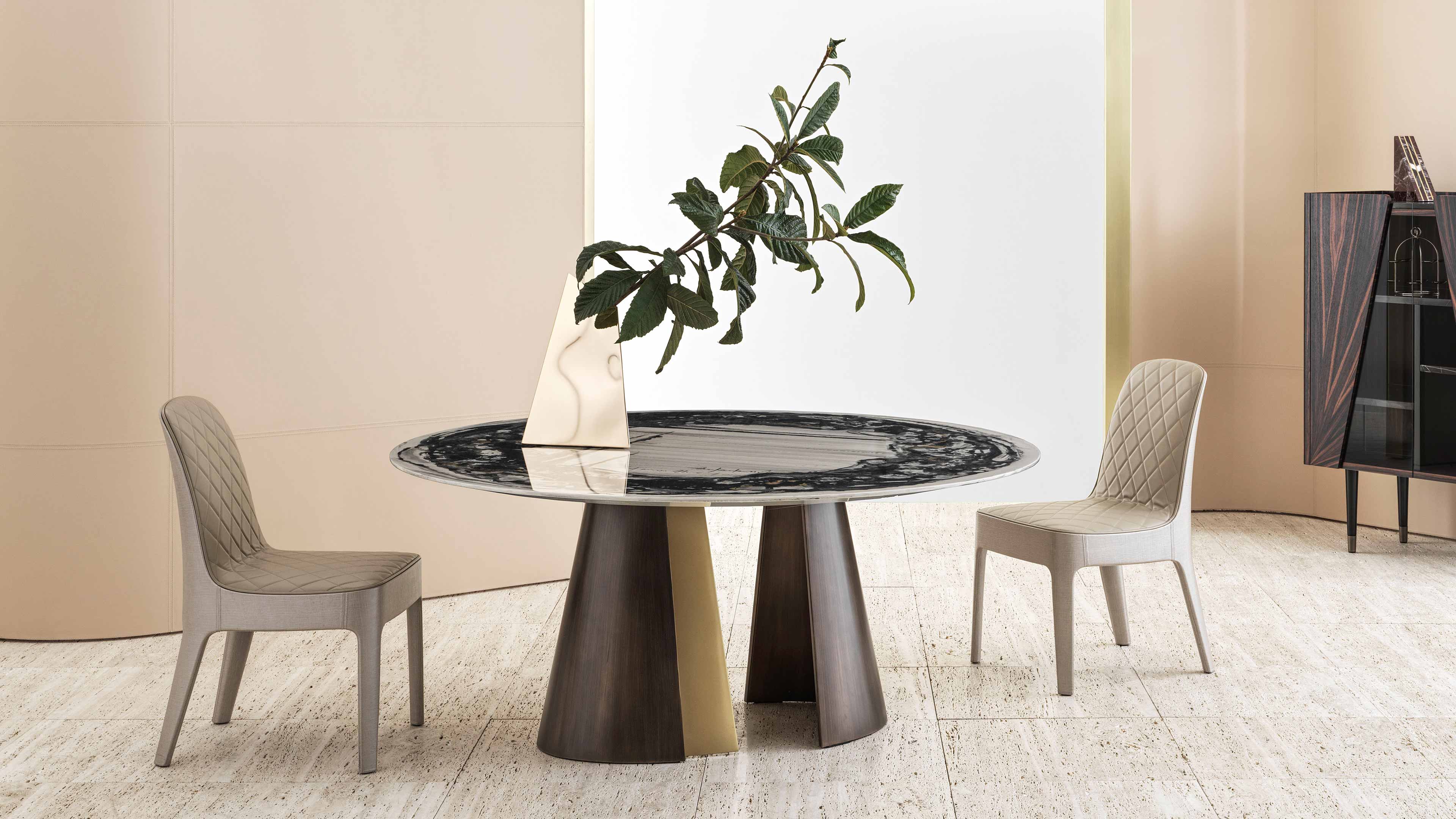 A brecciated marble with a creamy-white background and bold, spectacular veining in shades of purple and burgundy. It transforms the table into an iconic piece of furniture with a strong sculptural component.