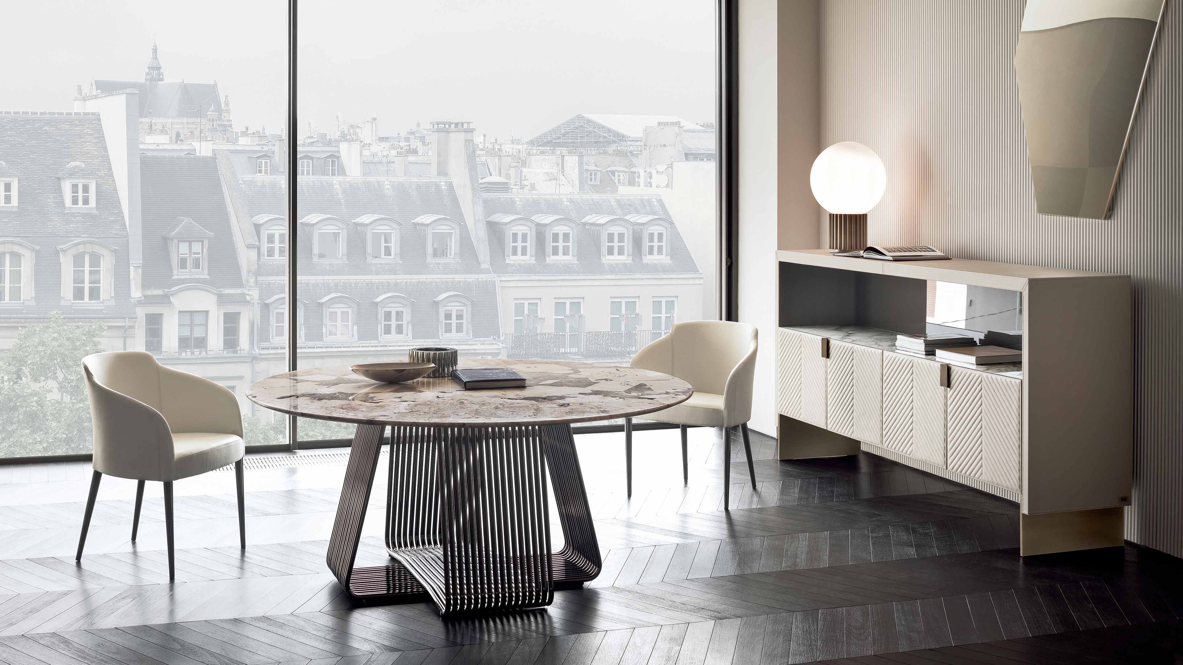 Iconic stone with warm tones from sand to hazelnut. Its striated structure gives table tops a monumental, solid, and timeless appearance.