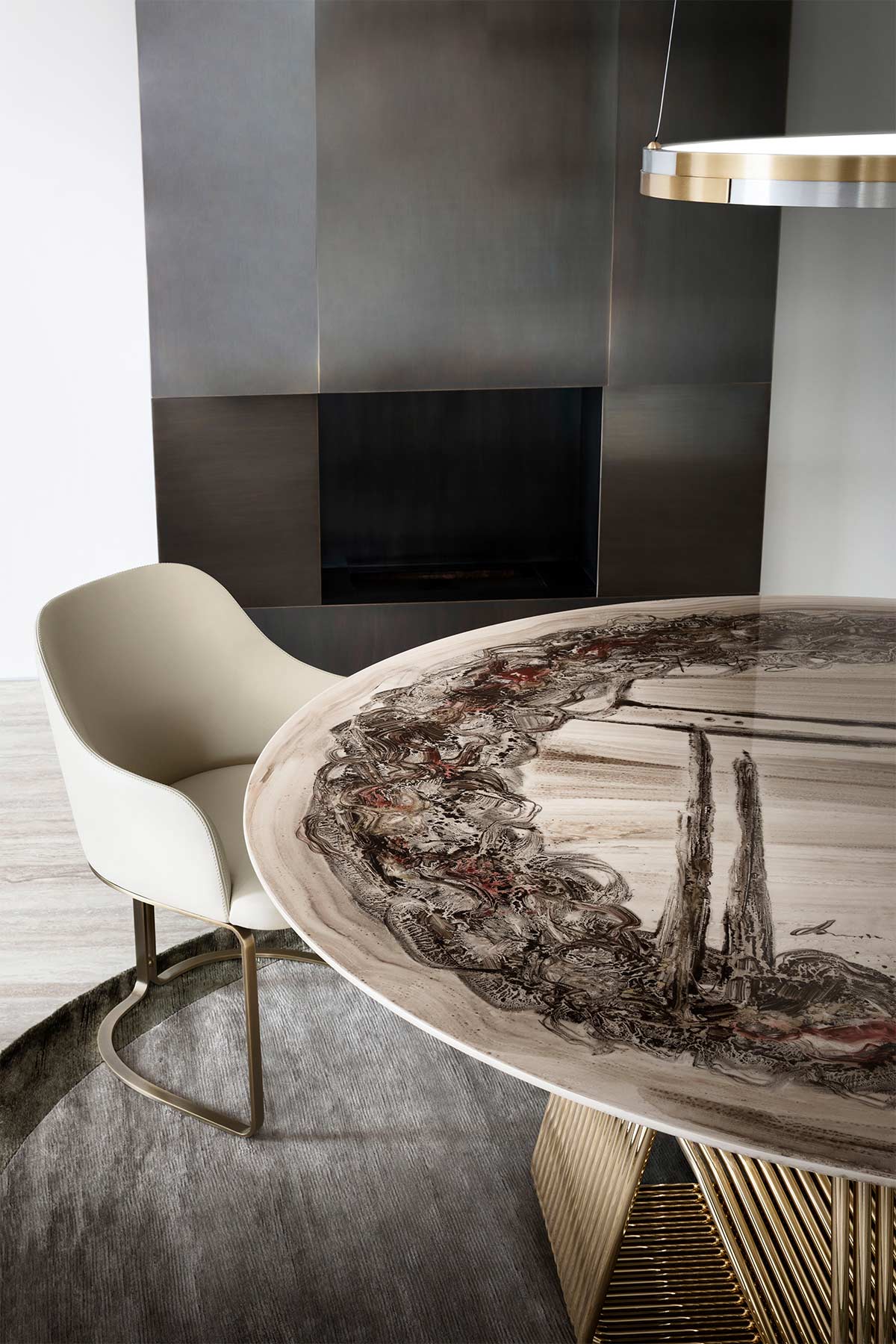 A bold marble with fluid green and grey layering. It transforms the table top into a dynamic natural element of high decorative value.