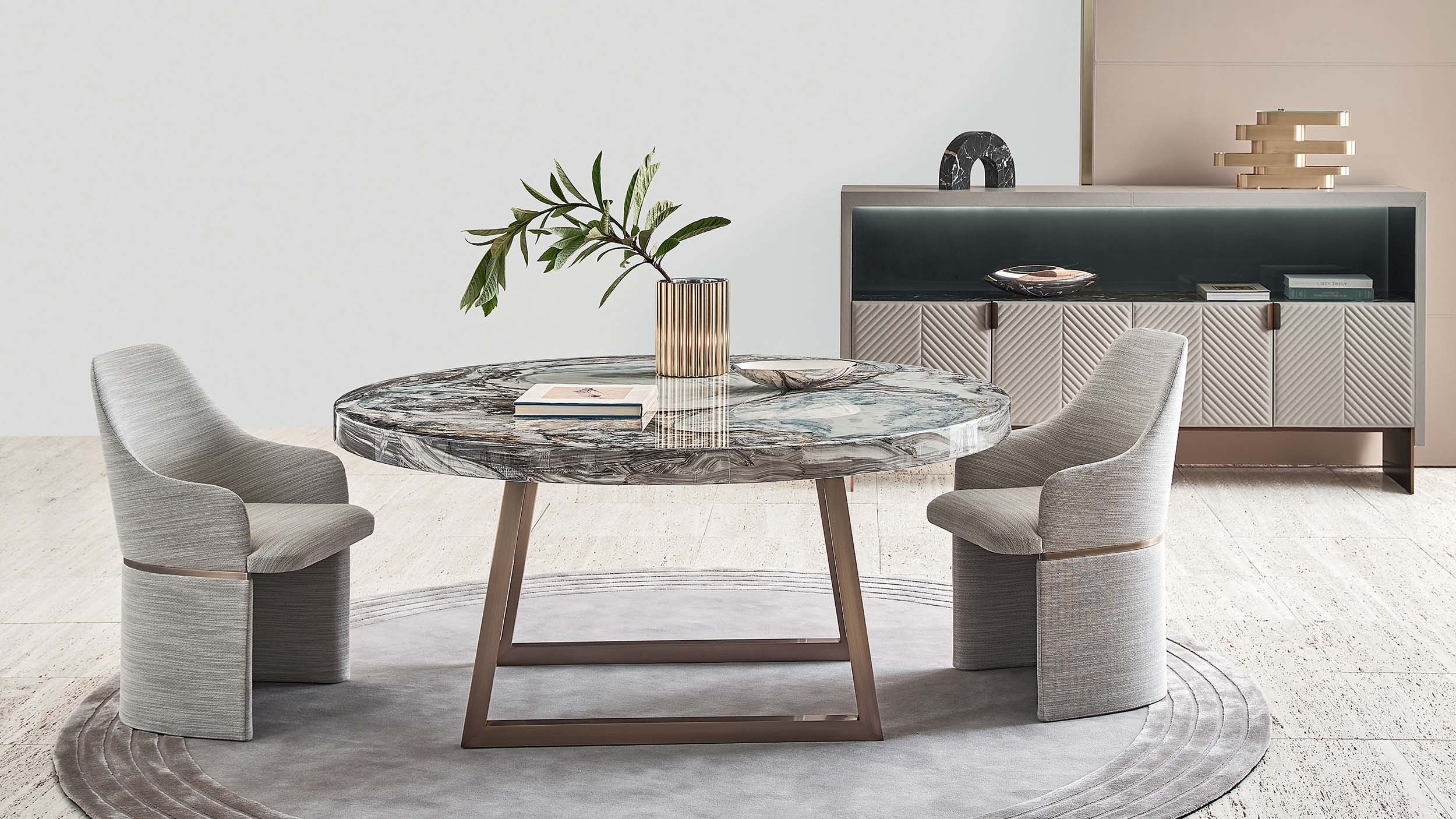 A bold marble with fluid green and grey layering. It transforms the table top into a dynamic natural element of high decorative value.