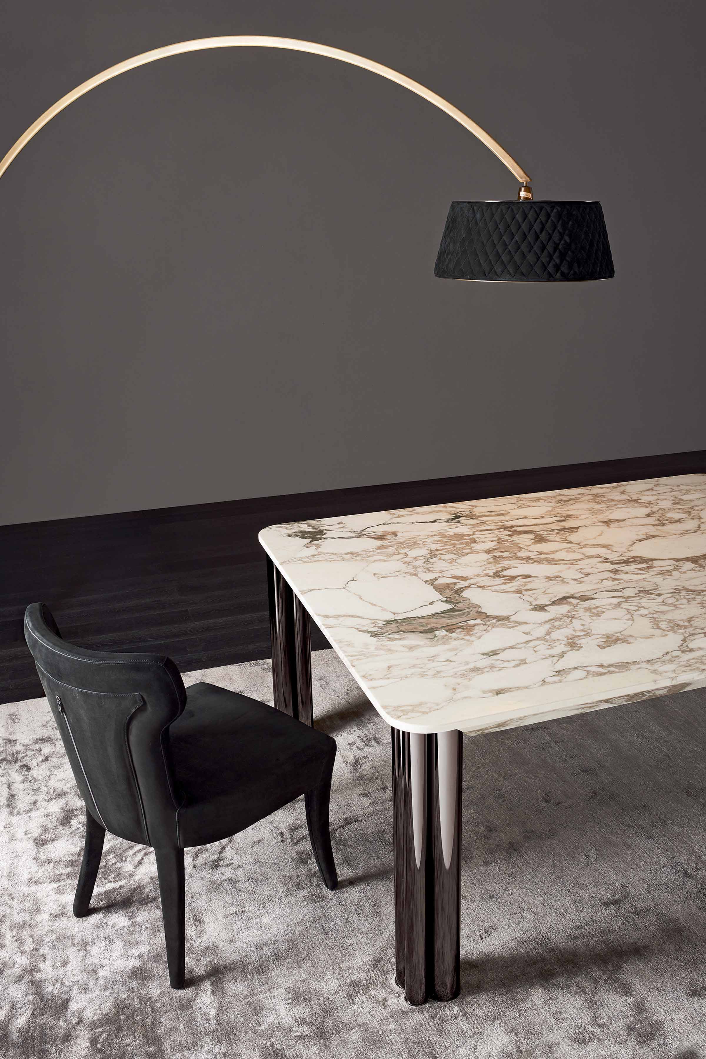 Gloss gold or black chromed legs composed by skilfully welded tubes. The top is available in a variety of dimensions and can be decorated, made out of wood or marble or upholstered in leather.