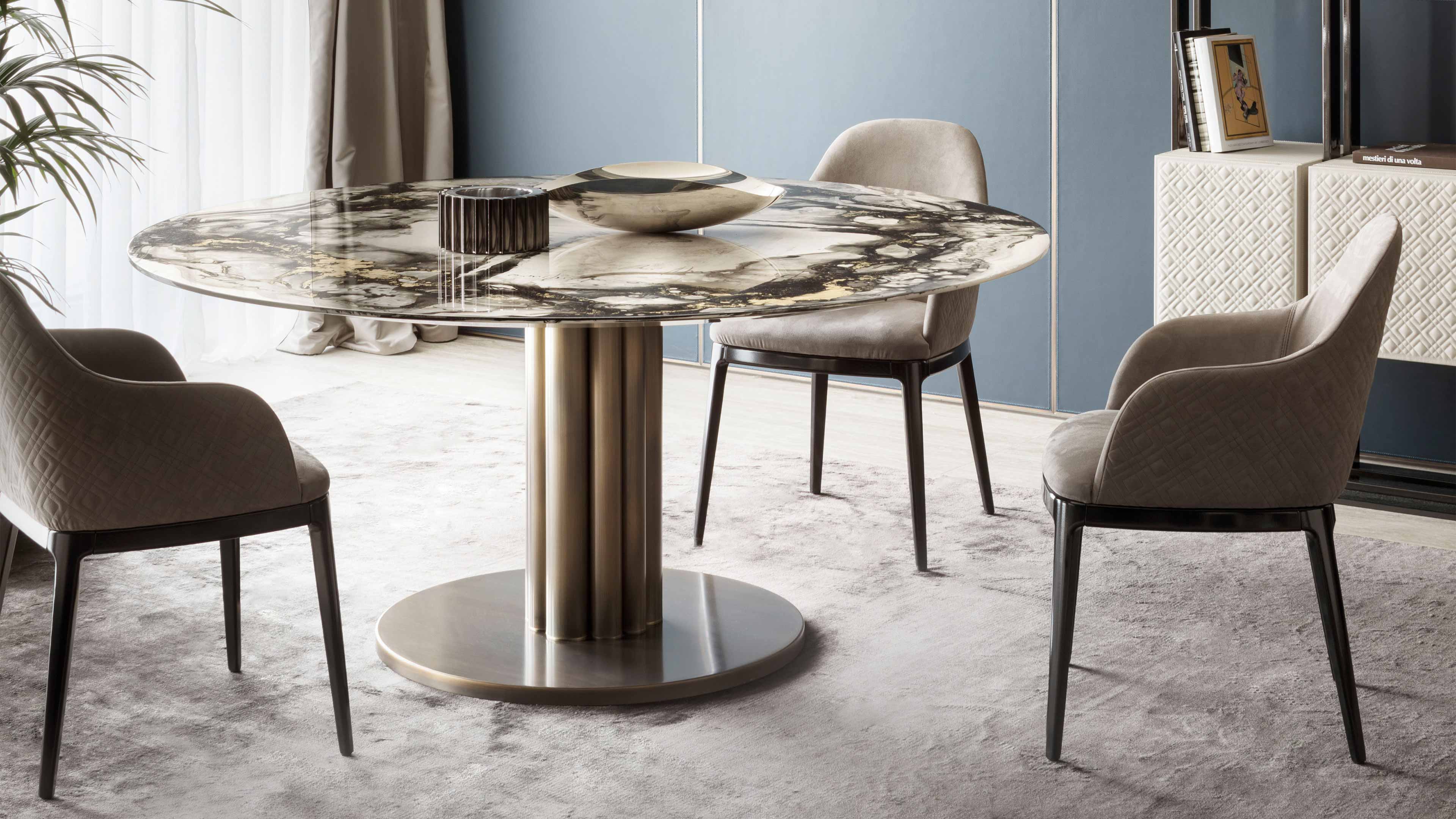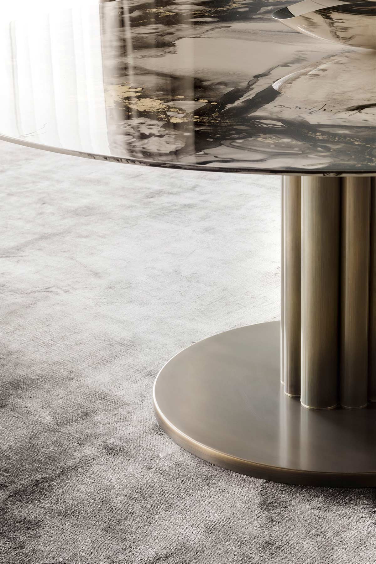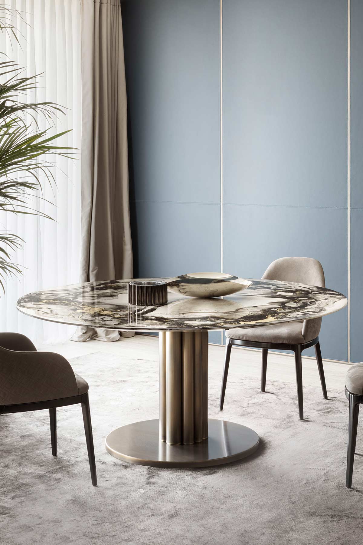 A bold marble with fluid green and grey layering. It transforms the table top into a dynamic natural element of high decorative value.