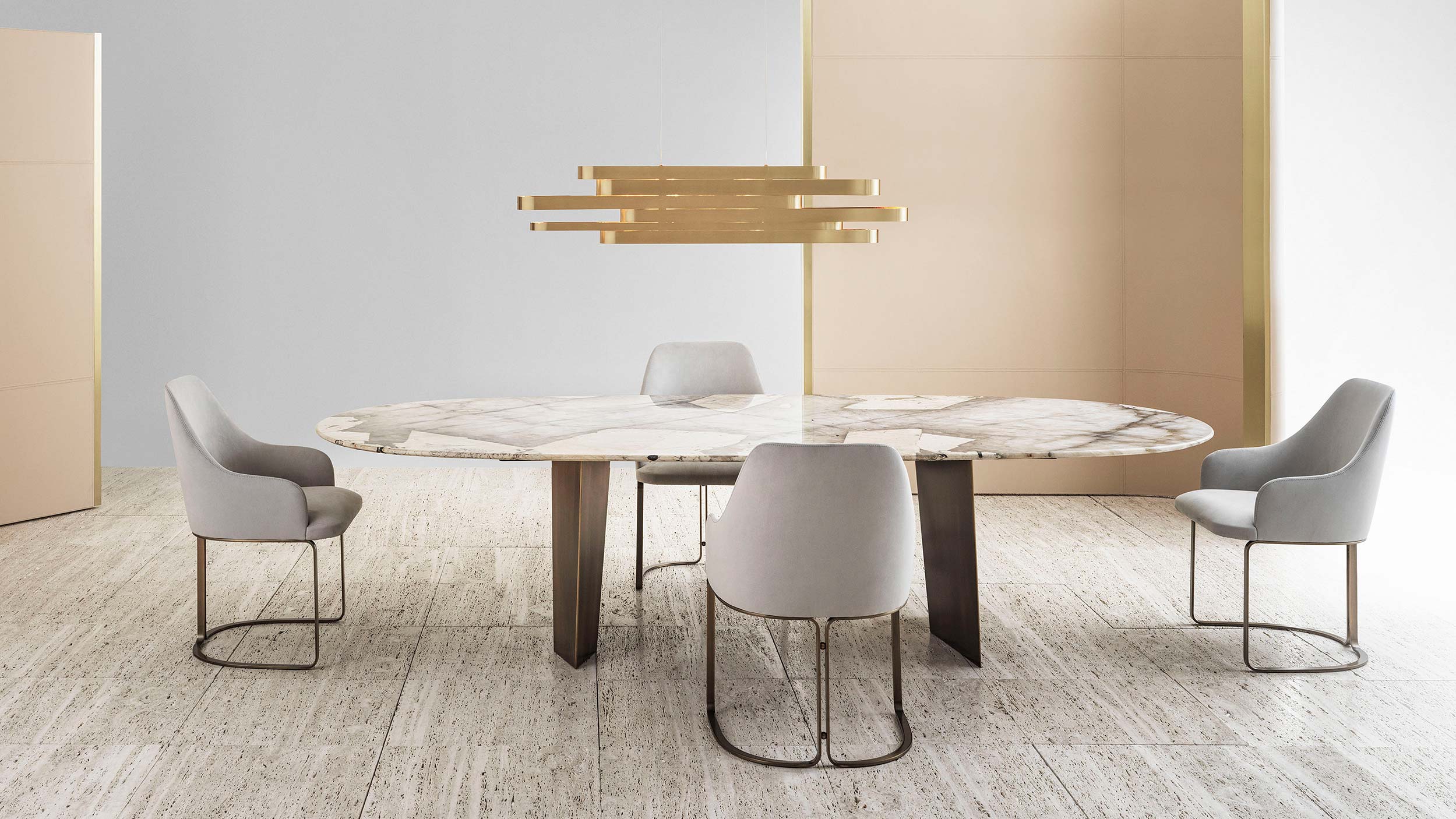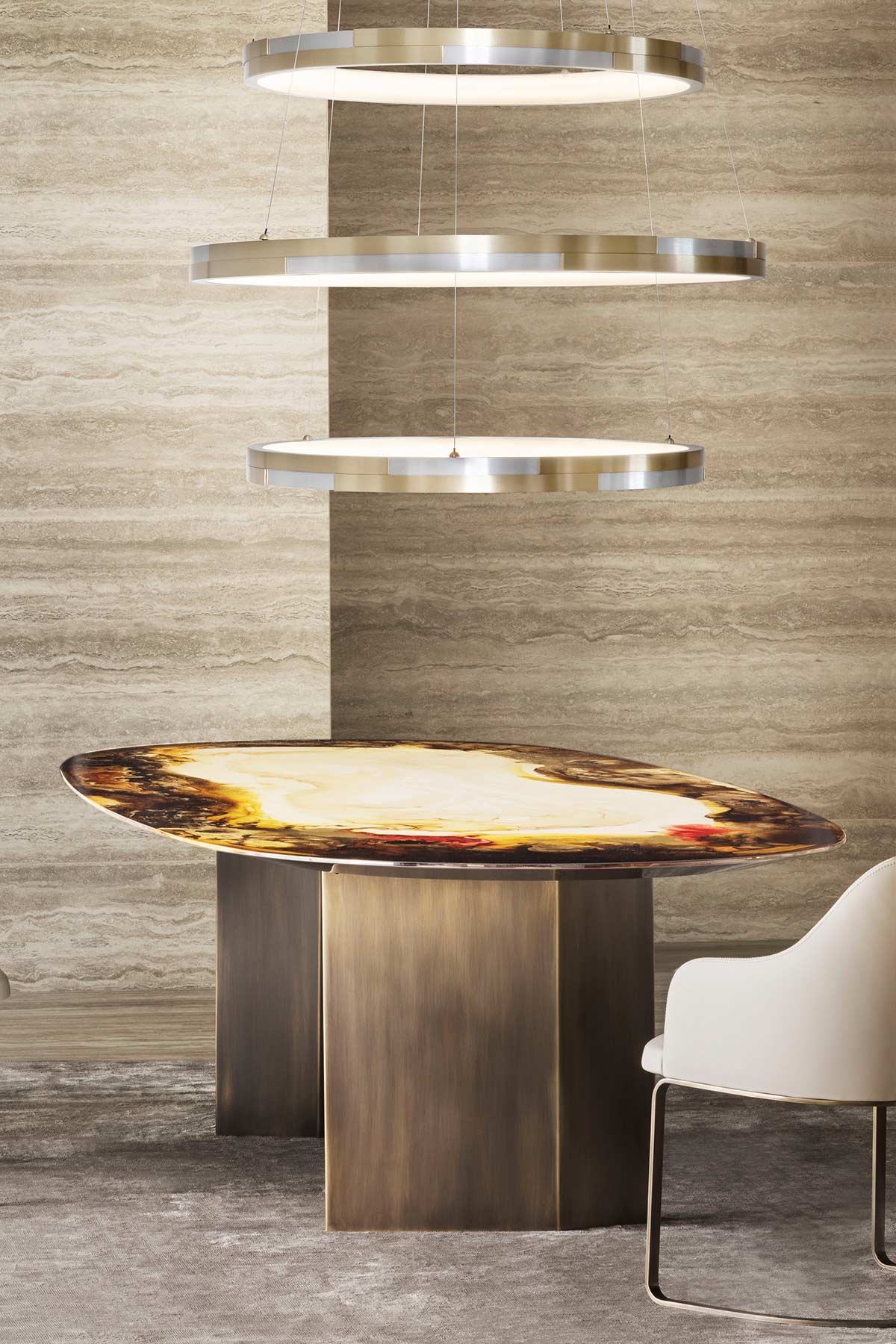 Iconic stone with warm tones from sand to hazelnut. Its striated structure gives table tops a monumental, solid, and timeless appearance.