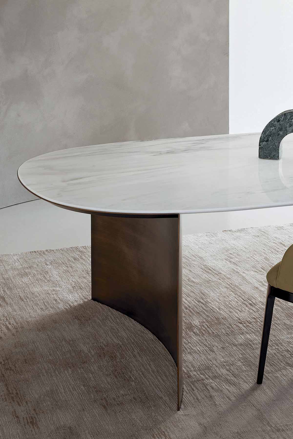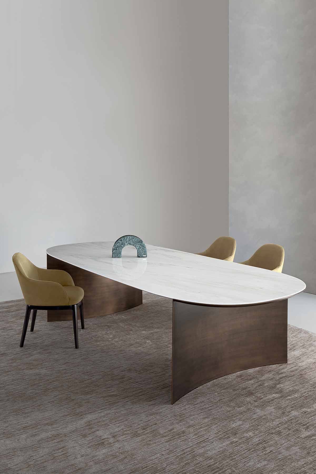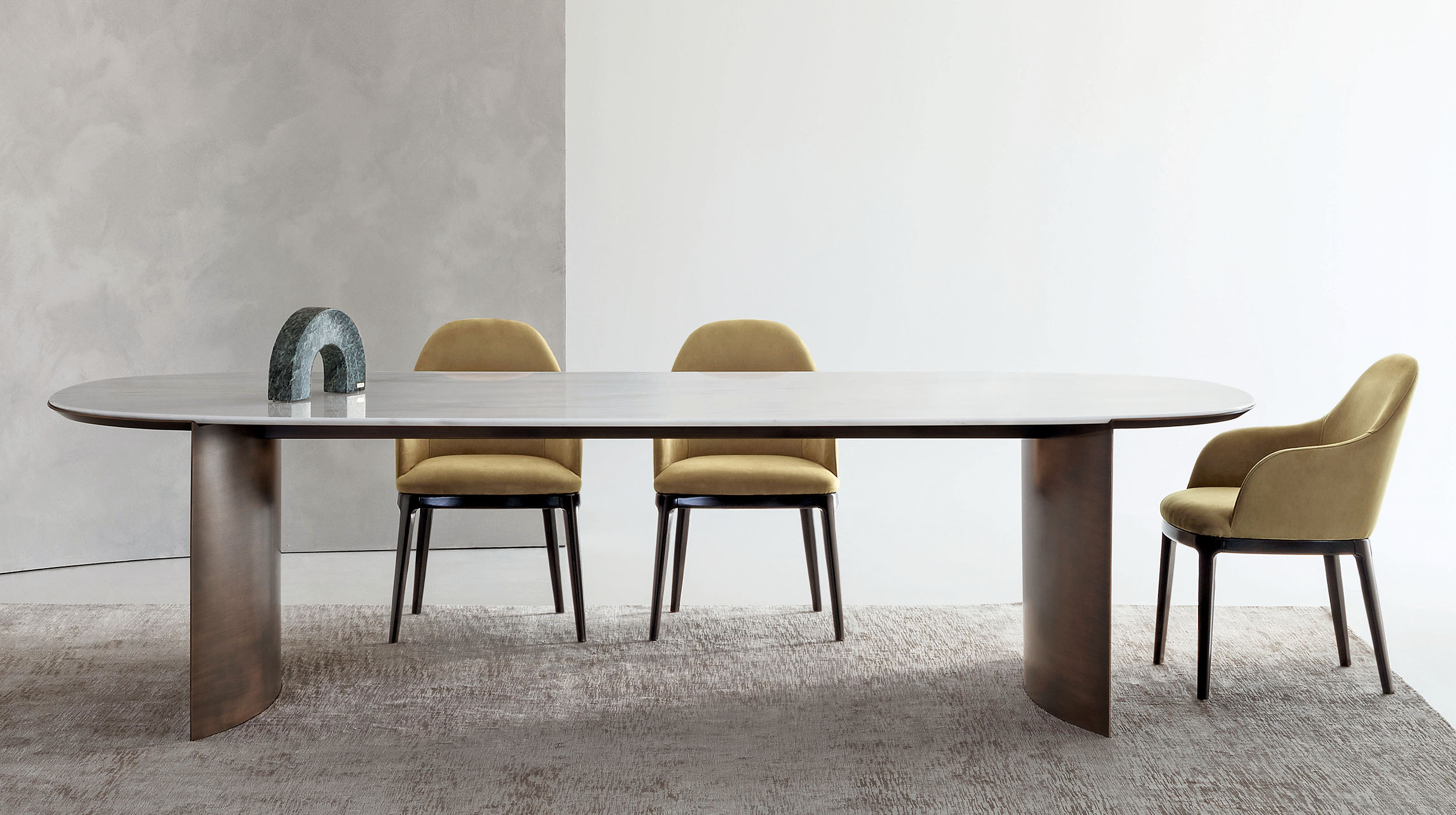 The top is available in wood, hand-decorated finish, or stone—offering a wide range of customization options to suit any interior identity. Refined finishes and sophisticated material combinations make President equally suited as a dining table or executive desk, confirming its expressive strength and versatility.