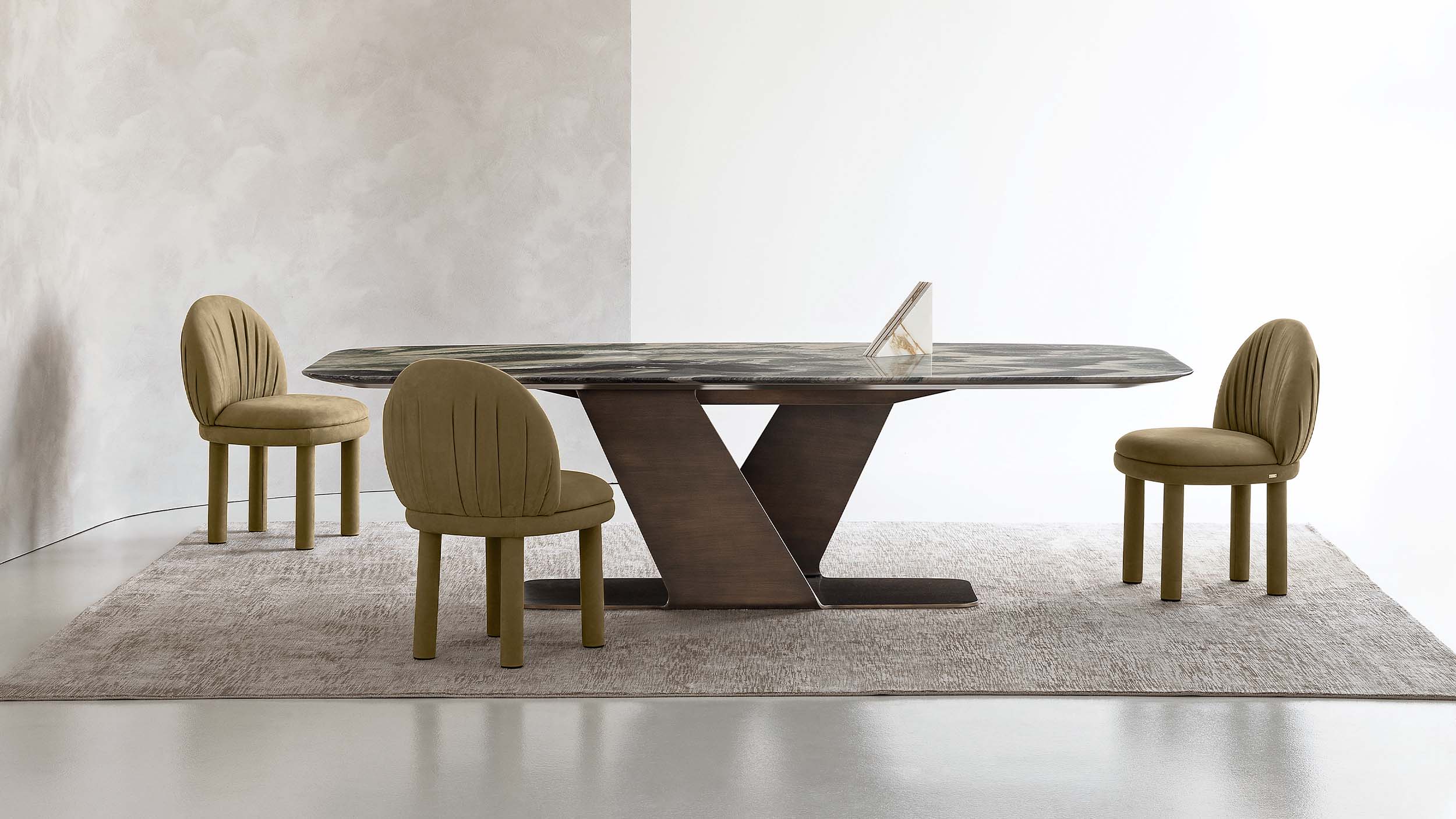 Skilled construction techniques merge with design to create a sculptural base enriched by different types of natural stone tops and the distinctive Rugiano Decoration.