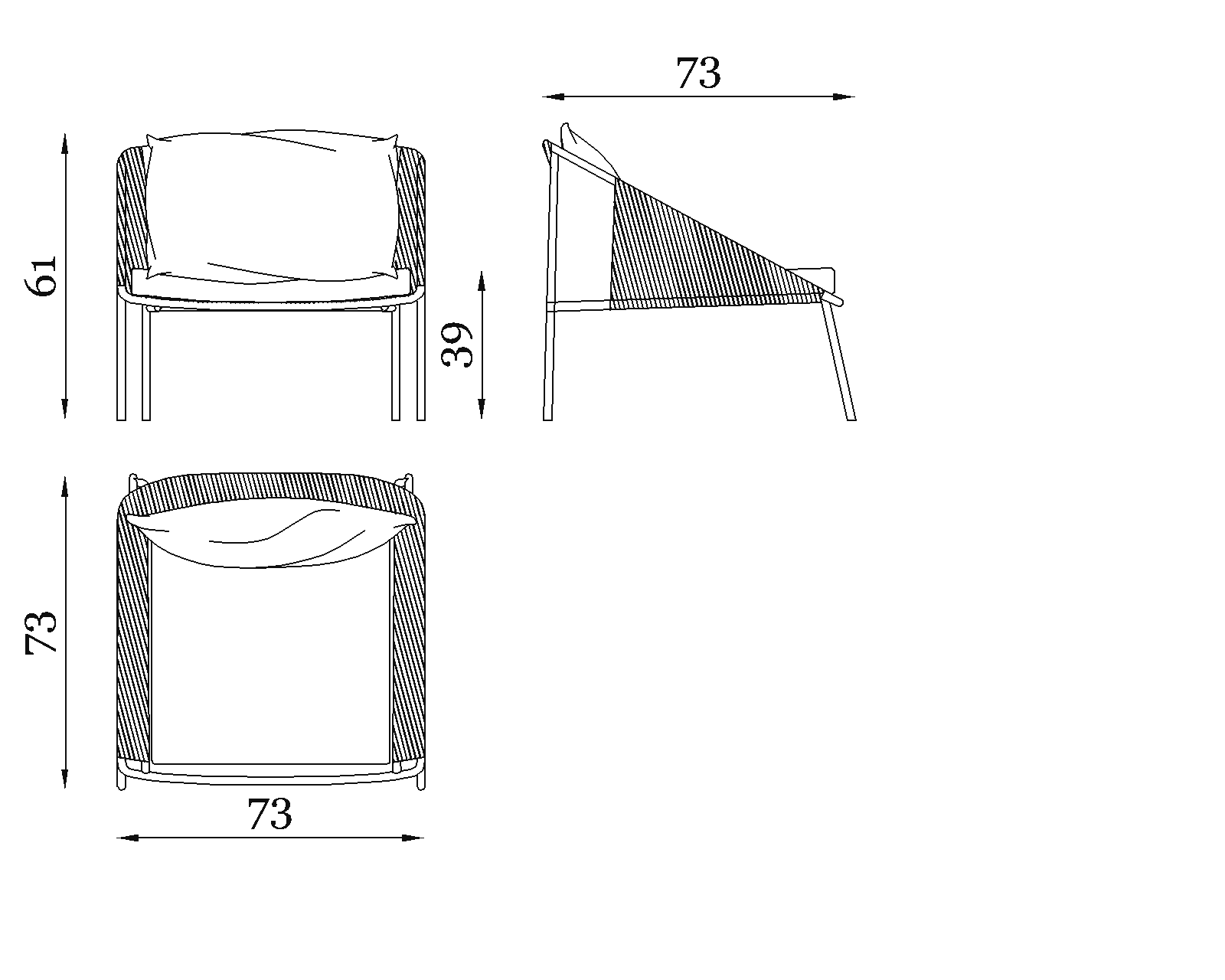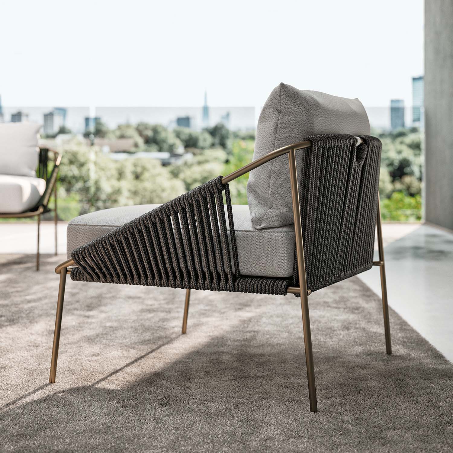 The bronze-painted aluminum frame hosts a hand-woven rope weave stretched along the sides and backrest, offering visual rhythm and artisanal flair. The slender armrests and generous seat, completed by soft, inviting cushions, provide comfort and lightness—an invitation to pause and unwind.