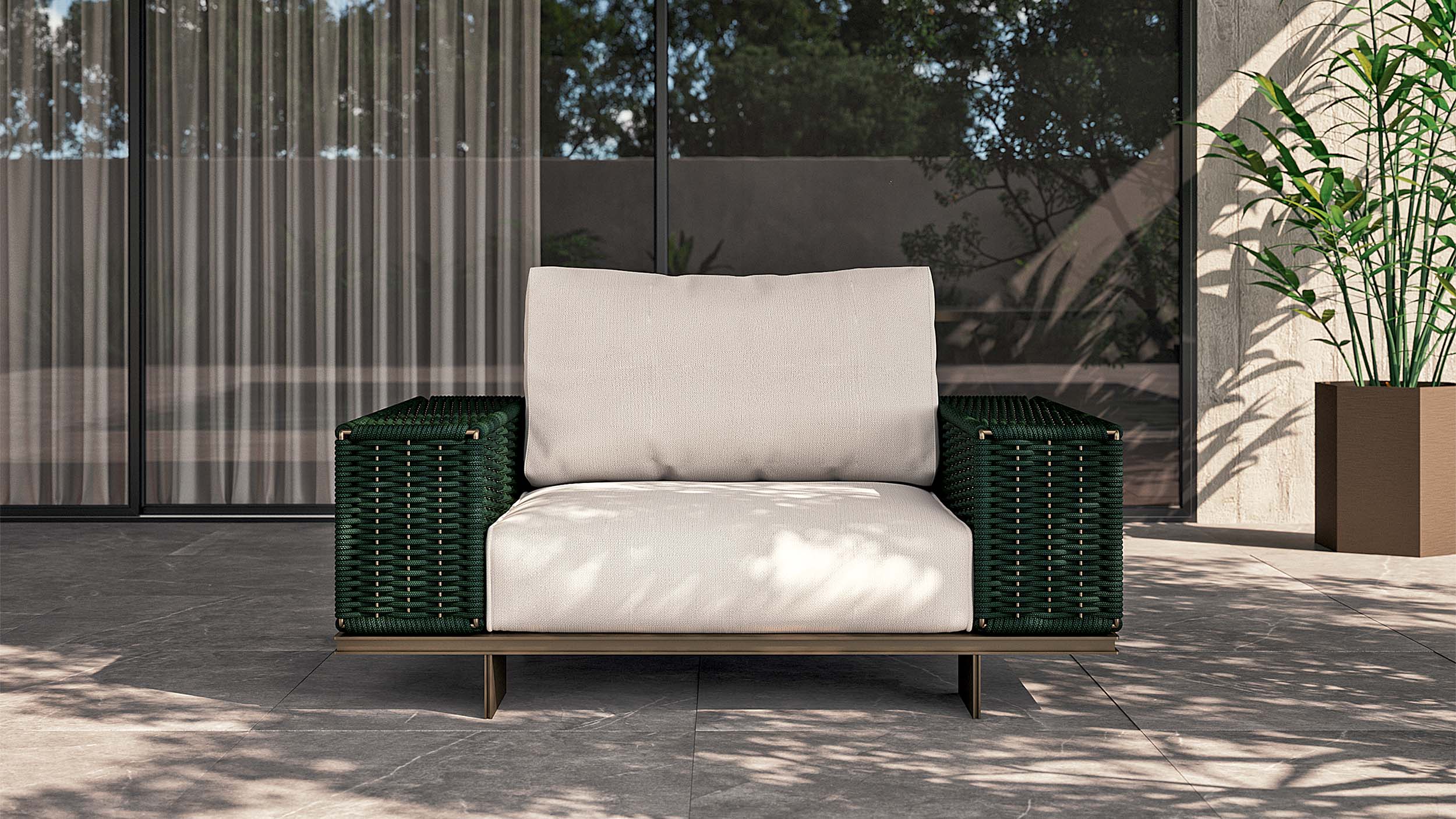 The Memphis armchair reinterprets the aesthetic codes of the namesake collection in a compact yet equally expressive version. The structure in outdoor bronze aluminum, both lightweight and solid, supports a rich hand-woven ropeweave that wraps around the backrest and sides in a continuous, rhythmic, and sophisticated pattern.