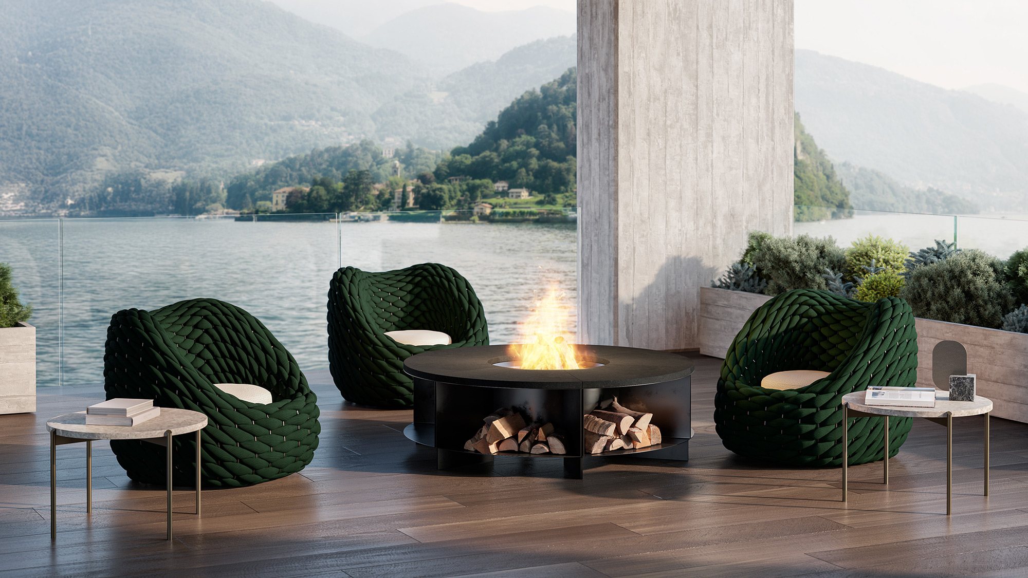 Its round, compact shape evokes a welcoming nest, creating a seat with a strong identity designed to blend design and comfort in refined outdoor settings.