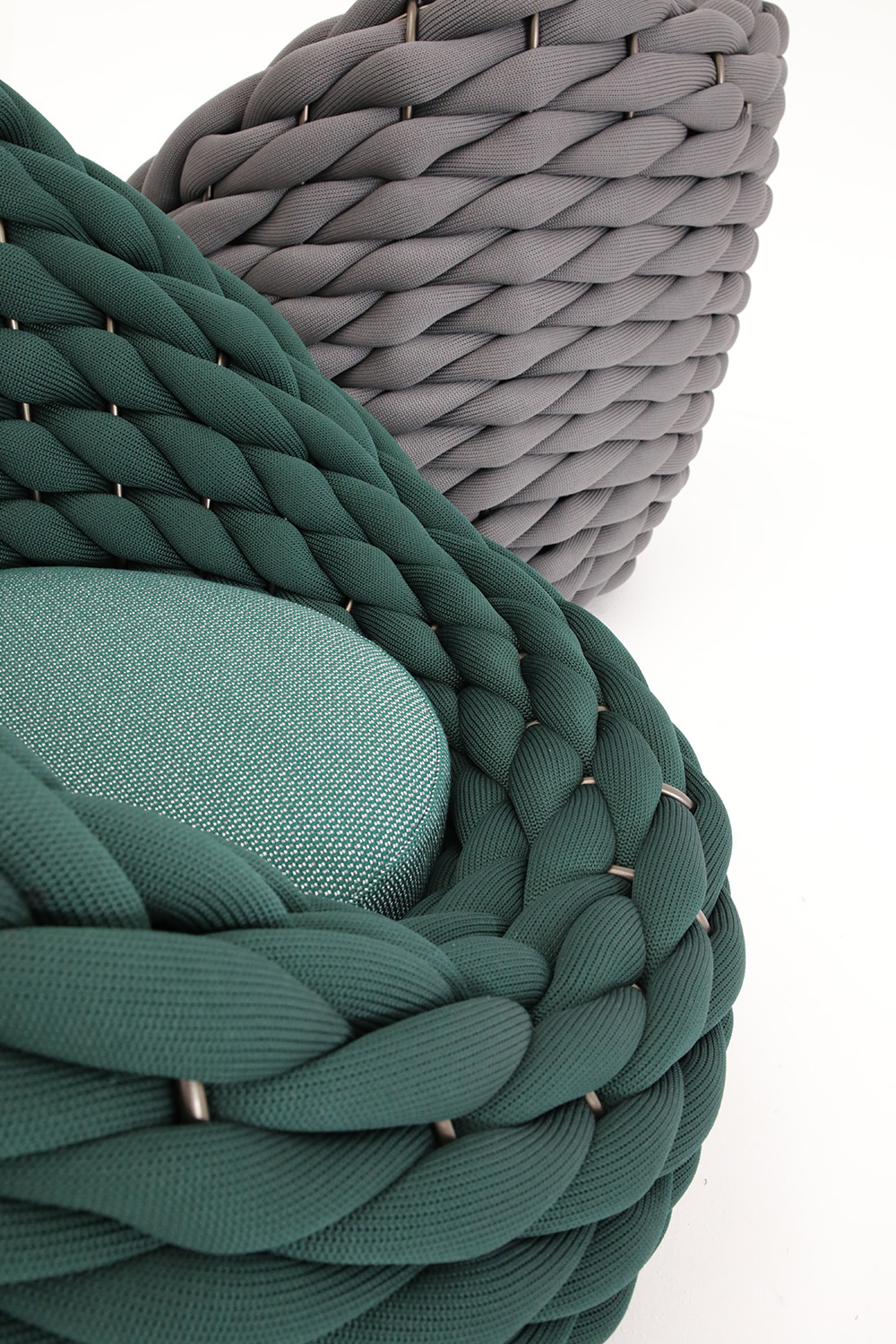 The Alluminio bronzo outdoor frame supports a hand-woven padded tubular weave, rich in movement and three-dimensionality.