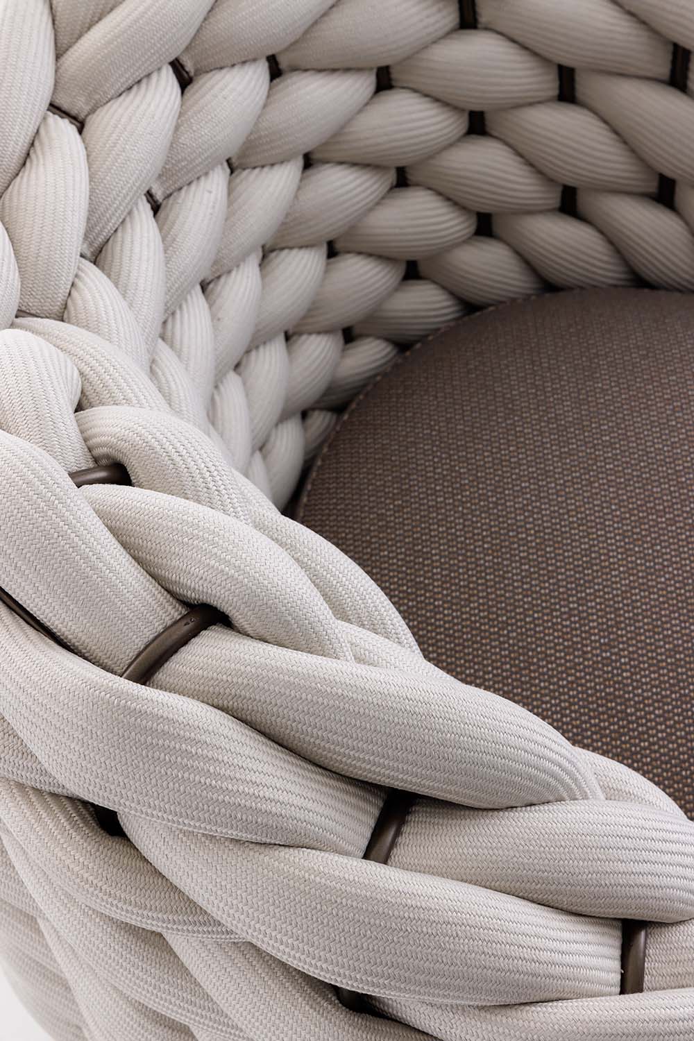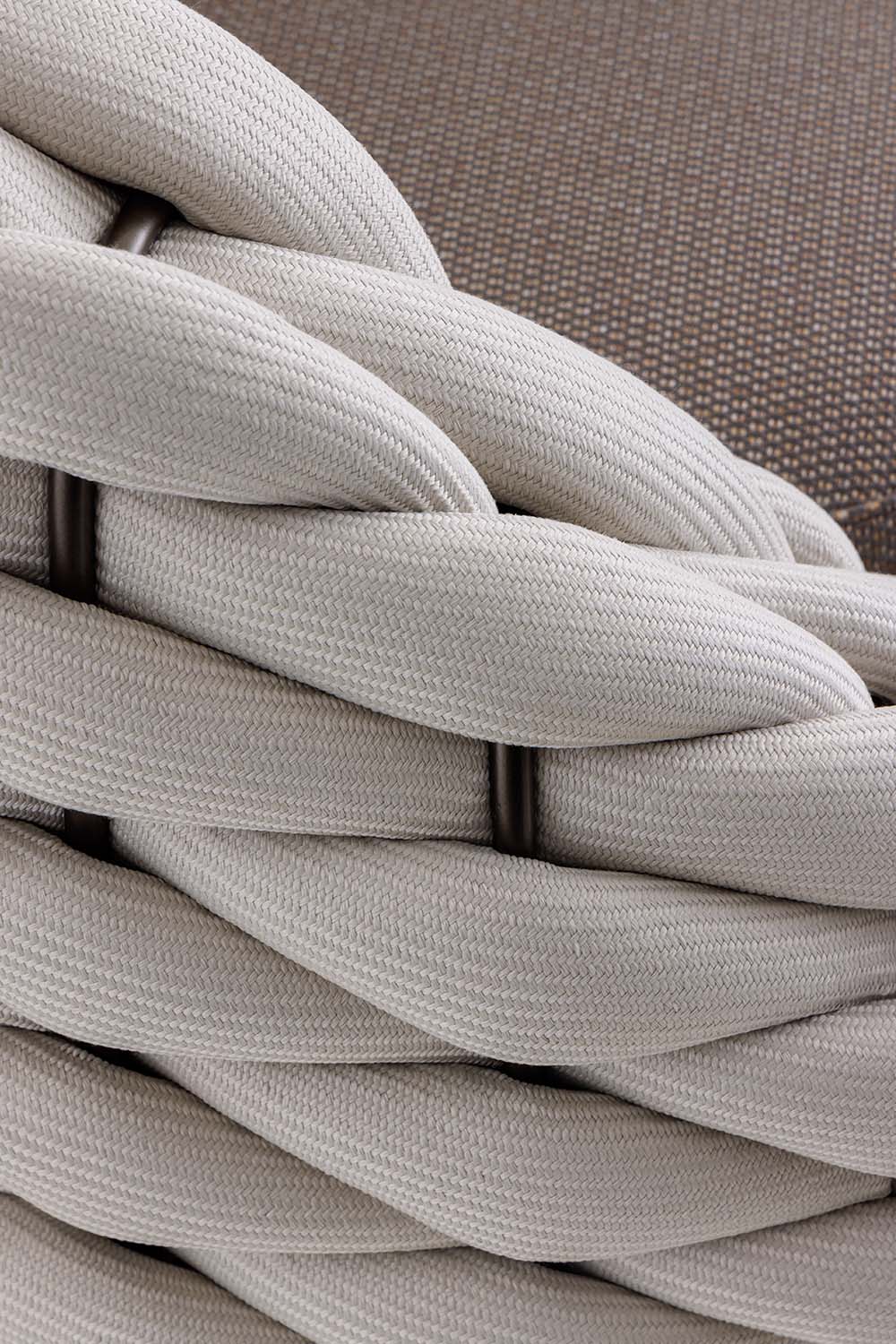 The Soft Ropes collection represents the evolution of the outdoor weaving concept towards maximum comfort. These ropes stand out for their increased diameter and a padded inner core that provides superior softness to the touch. The voluminous craftsmanship simulates the warmth and coziness of indoor fabrics, transforming outdoor sofas and armchairs into havens of pure relaxation.