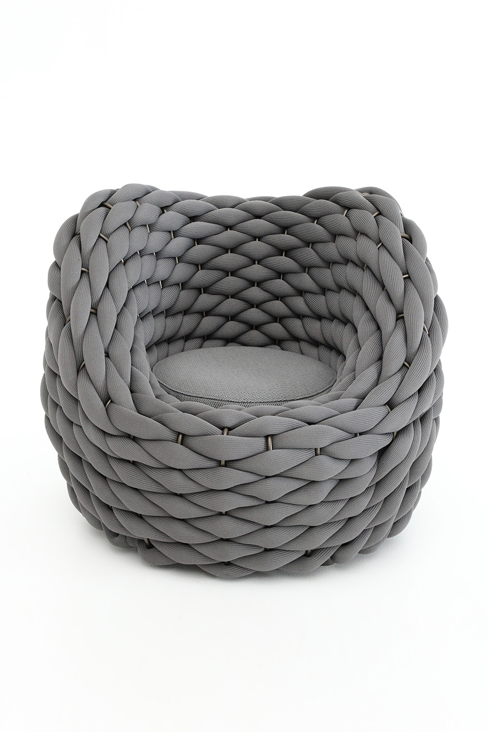 At the center, the circular cushion provides a generous and inviting support, perfect for relaxing on a terrace or in the garden. Nido is an armchair that furnishes with style, merging comfort and aesthetic research in a single design gesture.