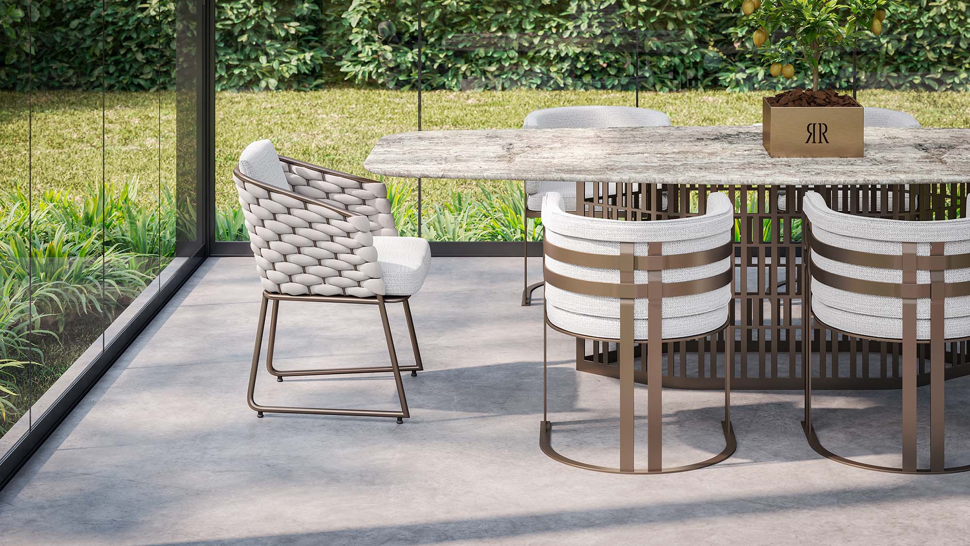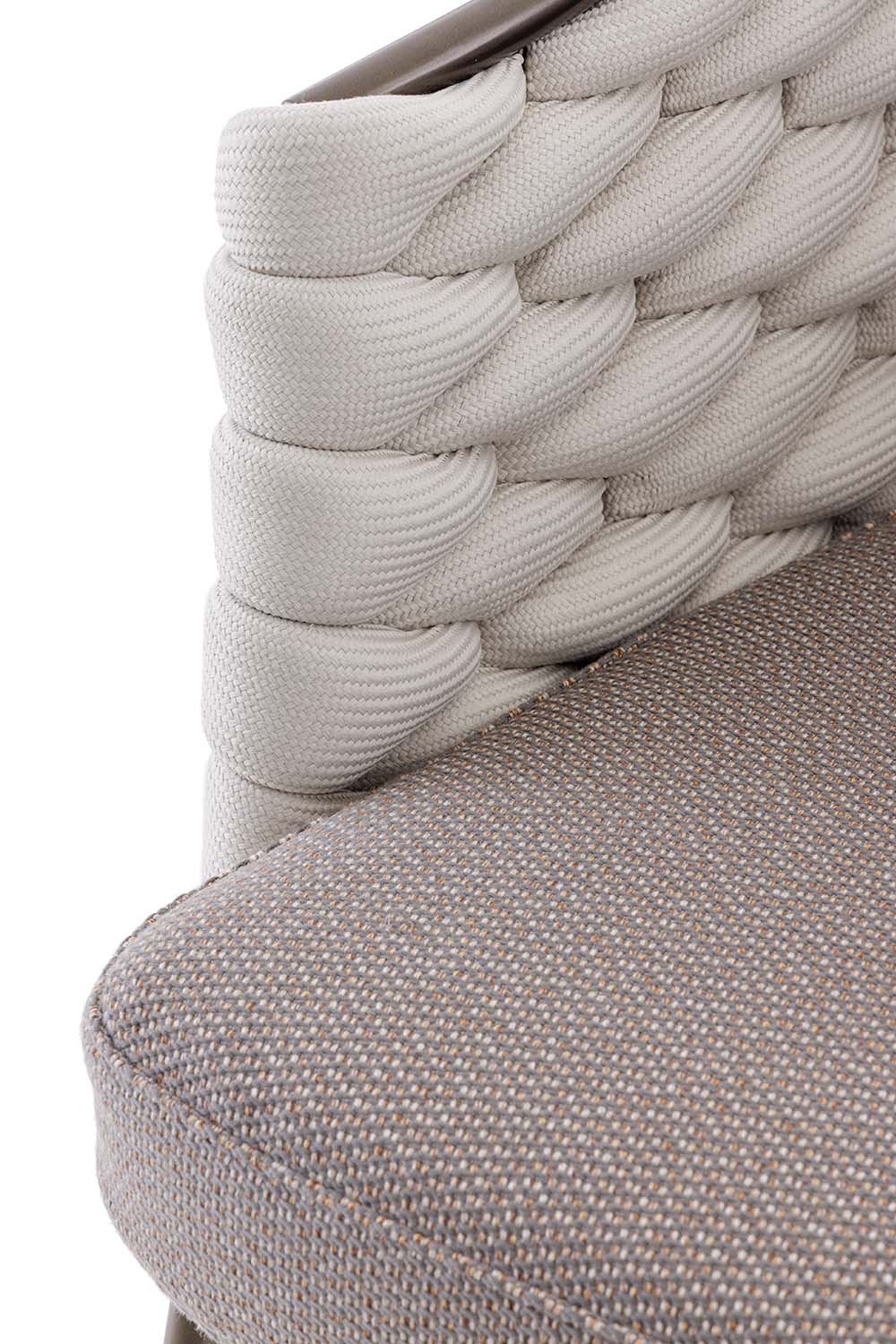 The dense and harmonious woven pattern gives the seat a unique graphic rhythm, while the outdoor bronze metal frame ensures solidity and durability without weighing down the overall design.
