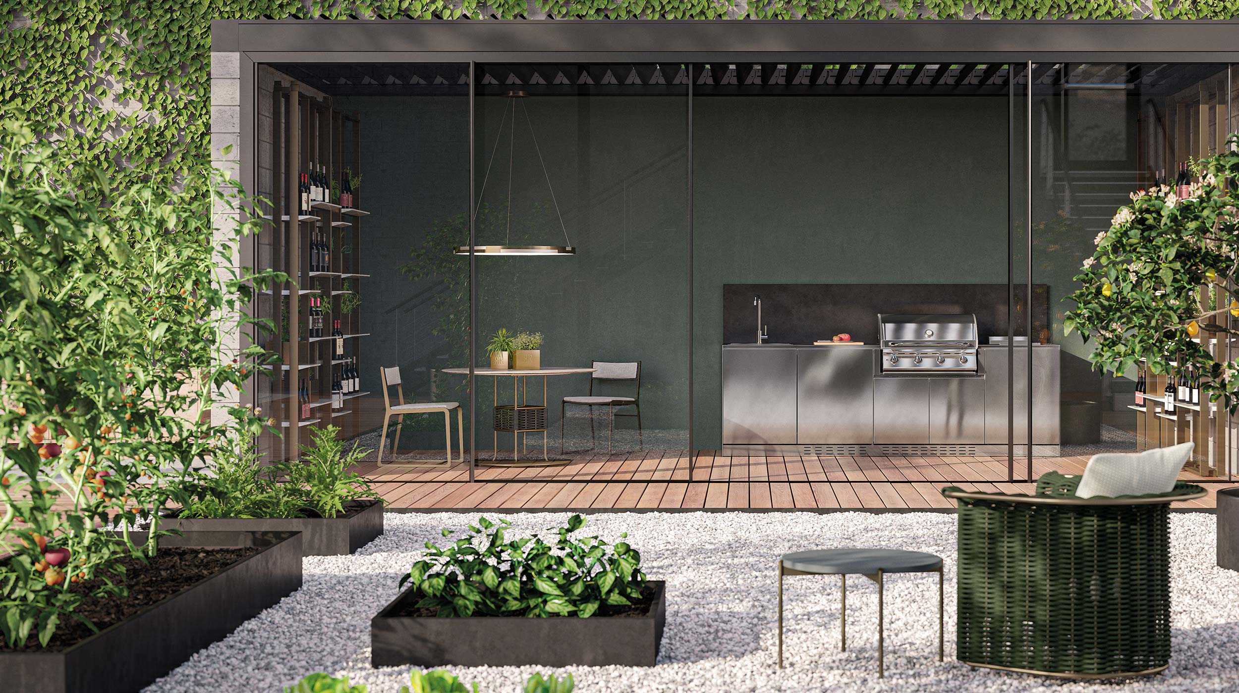 Its silhouette—defined by taut lines and essential volumes—stands out for its graphical base in outdoor bronze-finished aluminum, solid yet visually light.