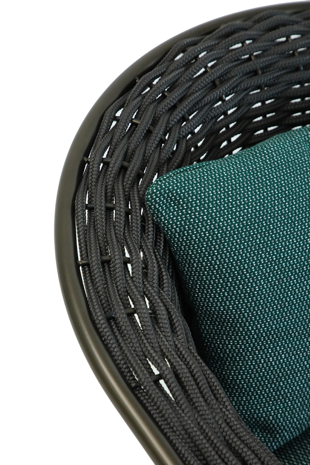 The padded seat and backrest, upholstered in outdoor performance fabric, provide comfort and support even in exposed settings, all while maintaining a clean, contemporary silhouette.