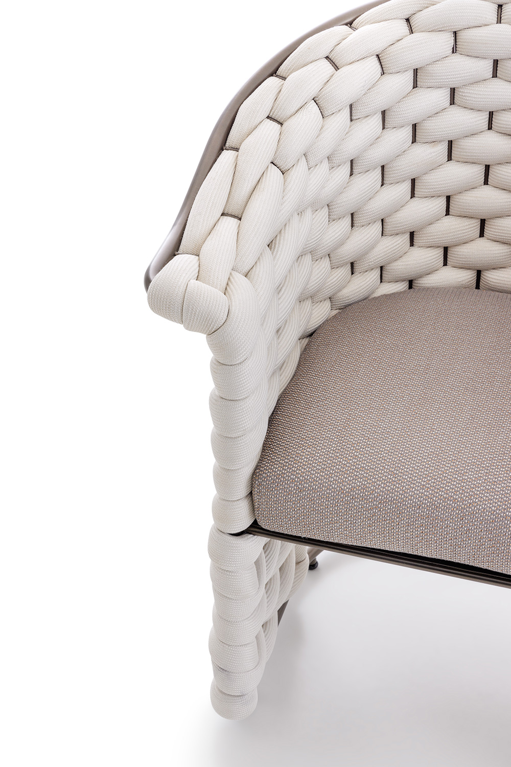 The supporting frame, crafted from curved outdoor bronze-finished metal, defines the chair’s form and accentuates its fluidity. The embracing backrest and the rich volume of the weave are balanced by the open base, giving the chair both visual lightness and structural solidity.