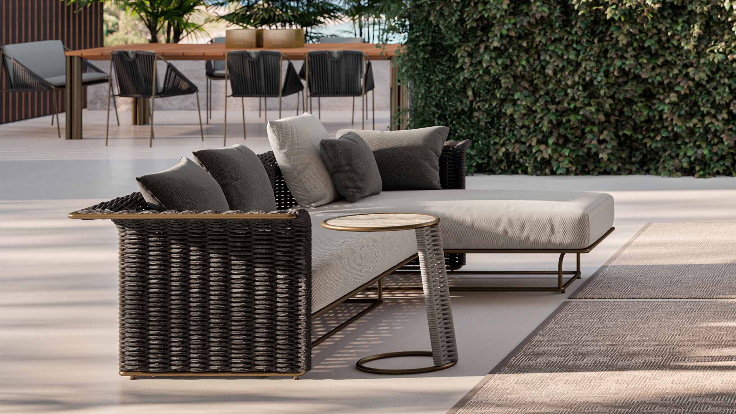 The bronze outdoor aluminum structure adds lightness and defines the character of the piece.It is available in two variations: with an intricate hand-woven rope weave, wrapping the back and sides in a rhythmic, harmonious pattern; or with a softly padded tubular version, offering a more welcoming and gentle look while maintaining strong visual impact.