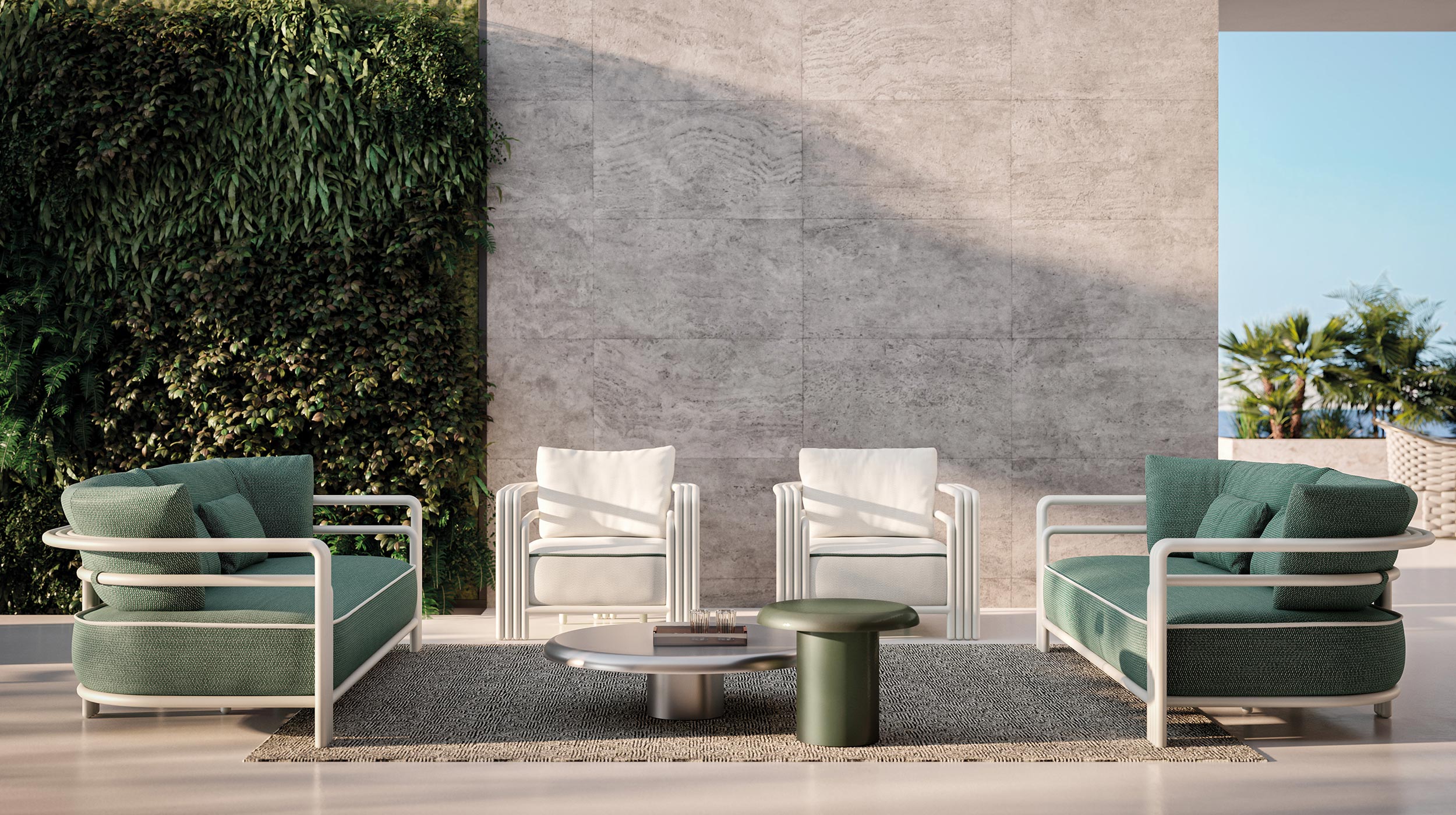 Their rounded lines and absence of sharp edges give the collection a sense of fluid lightness, allowing it to blend harmoniously into a variety of outdoor settings.