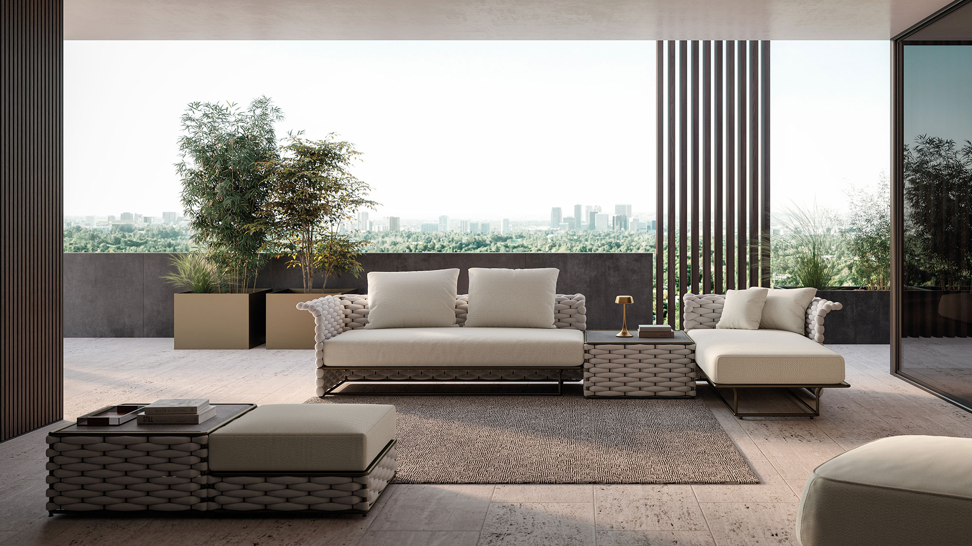The Soft Ropes collection represents the evolution of the outdoor weaving concept towards maximum comfort. These ropes stand out for their increased diameter and a padded inner core that provides superior softness to the touch. The voluminous craftsmanship simulates the warmth and coziness of indoor fabrics, transforming outdoor sofas and armchairs into havens of pure relaxation.