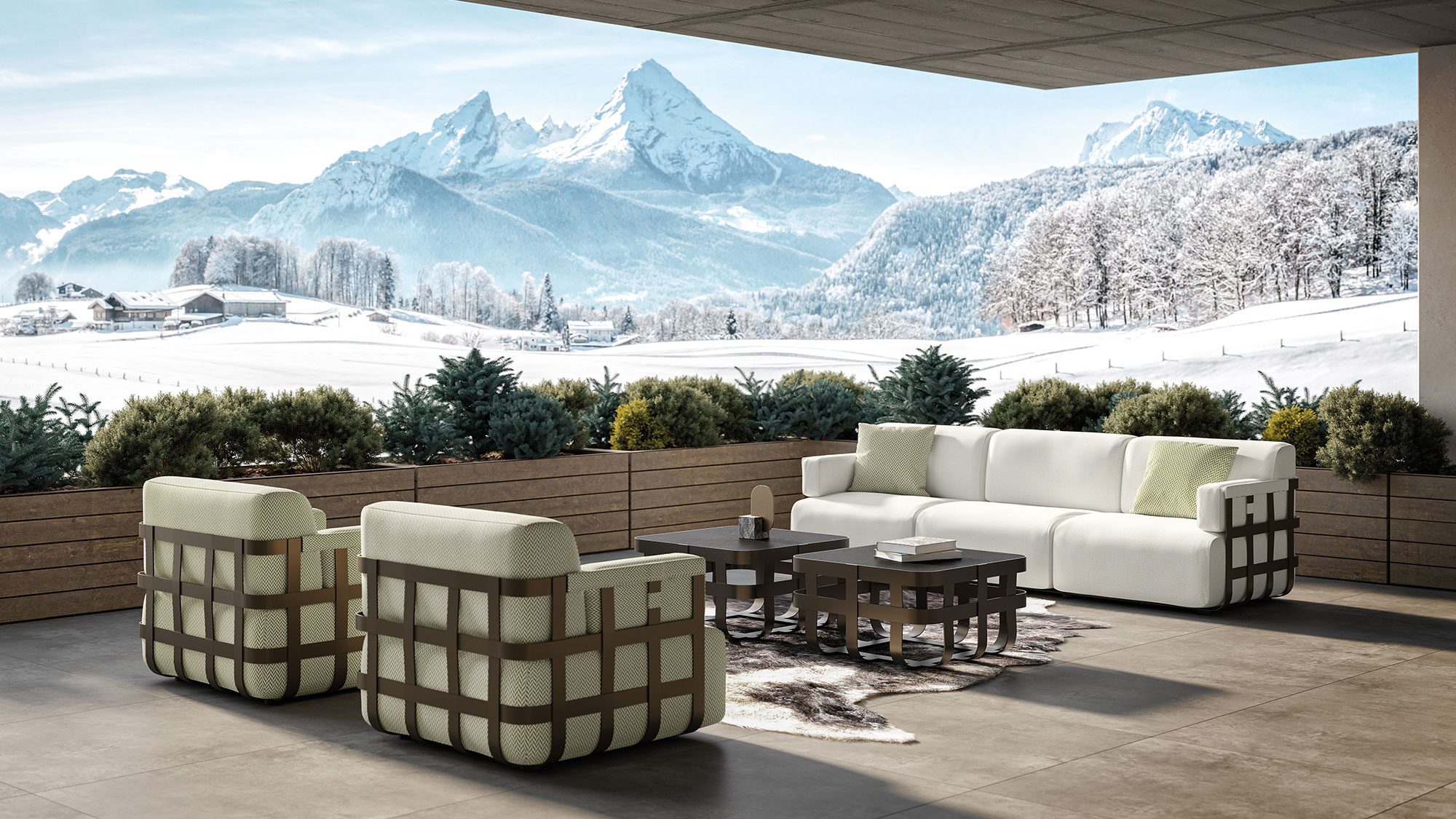 The result is a sofa with a sober yet distinctive style, designed for both residential and contract outdoor settings that demand elegance and performance.