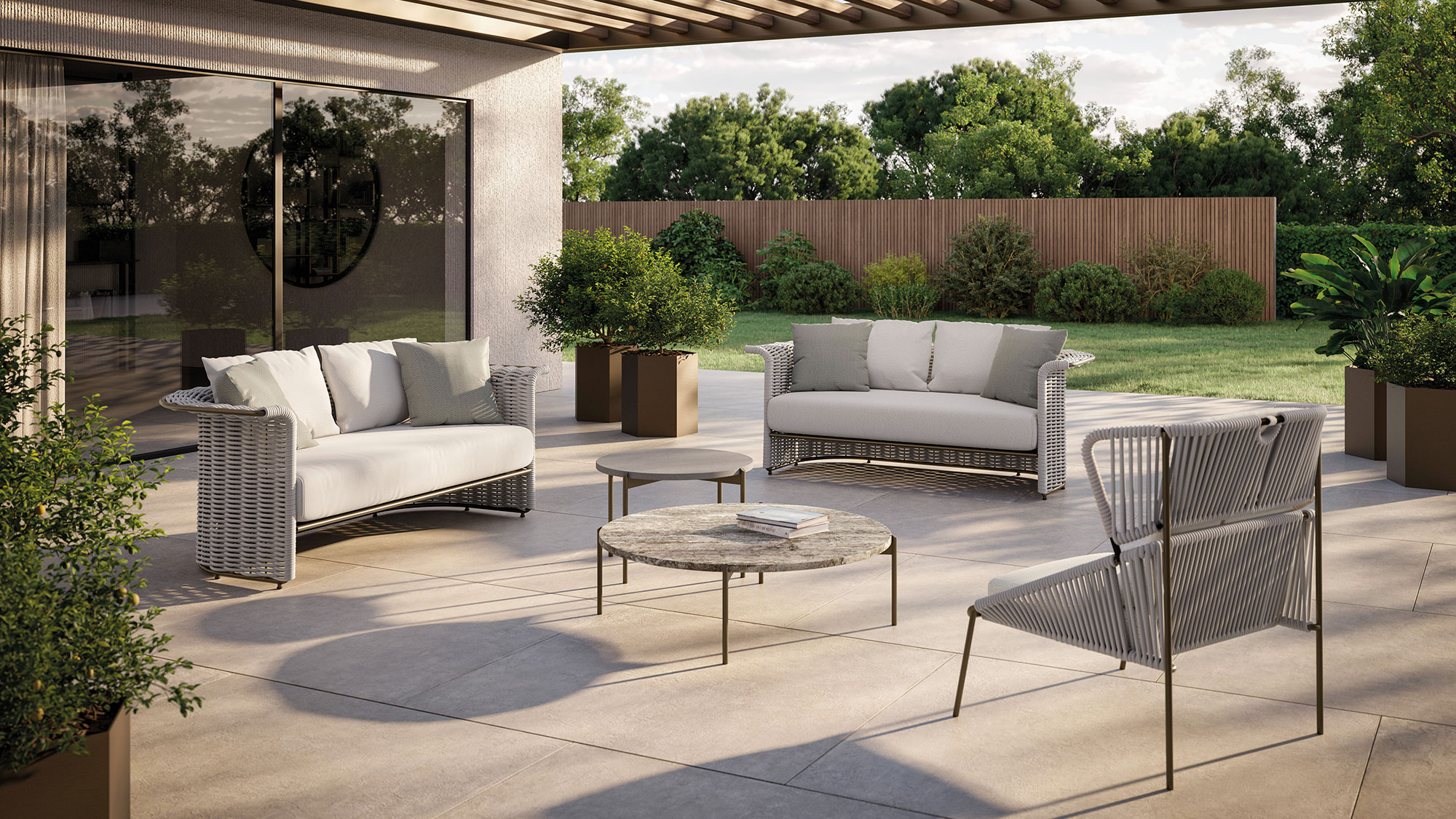 The Soft Ropes collection represents the evolution of the outdoor weaving concept towards maximum comfort. These ropes stand out for their increased diameter and a padded inner core that provides superior softness to the touch. The voluminous craftsmanship simulates the warmth and coziness of indoor fabrics, transforming outdoor sofas and armchairs into havens of pure relaxation.