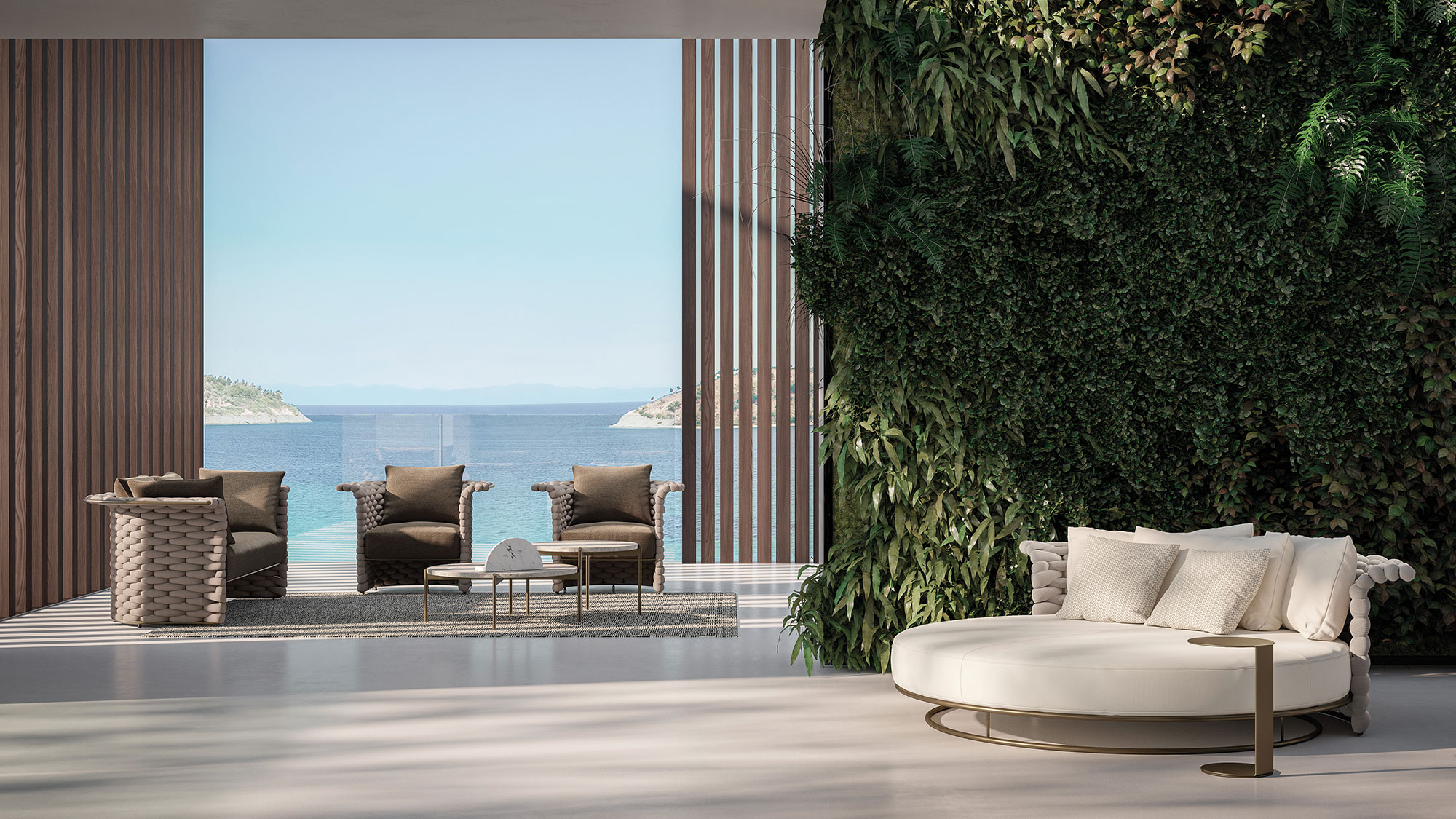 The Soft Ropes collection represents the evolution of the outdoor weaving concept towards maximum comfort. These ropes stand out for their increased diameter and a padded inner core that provides superior softness to the touch. The voluminous craftsmanship simulates the warmth and coziness of indoor fabrics, transforming outdoor sofas and armchairs into havens of pure relaxation.