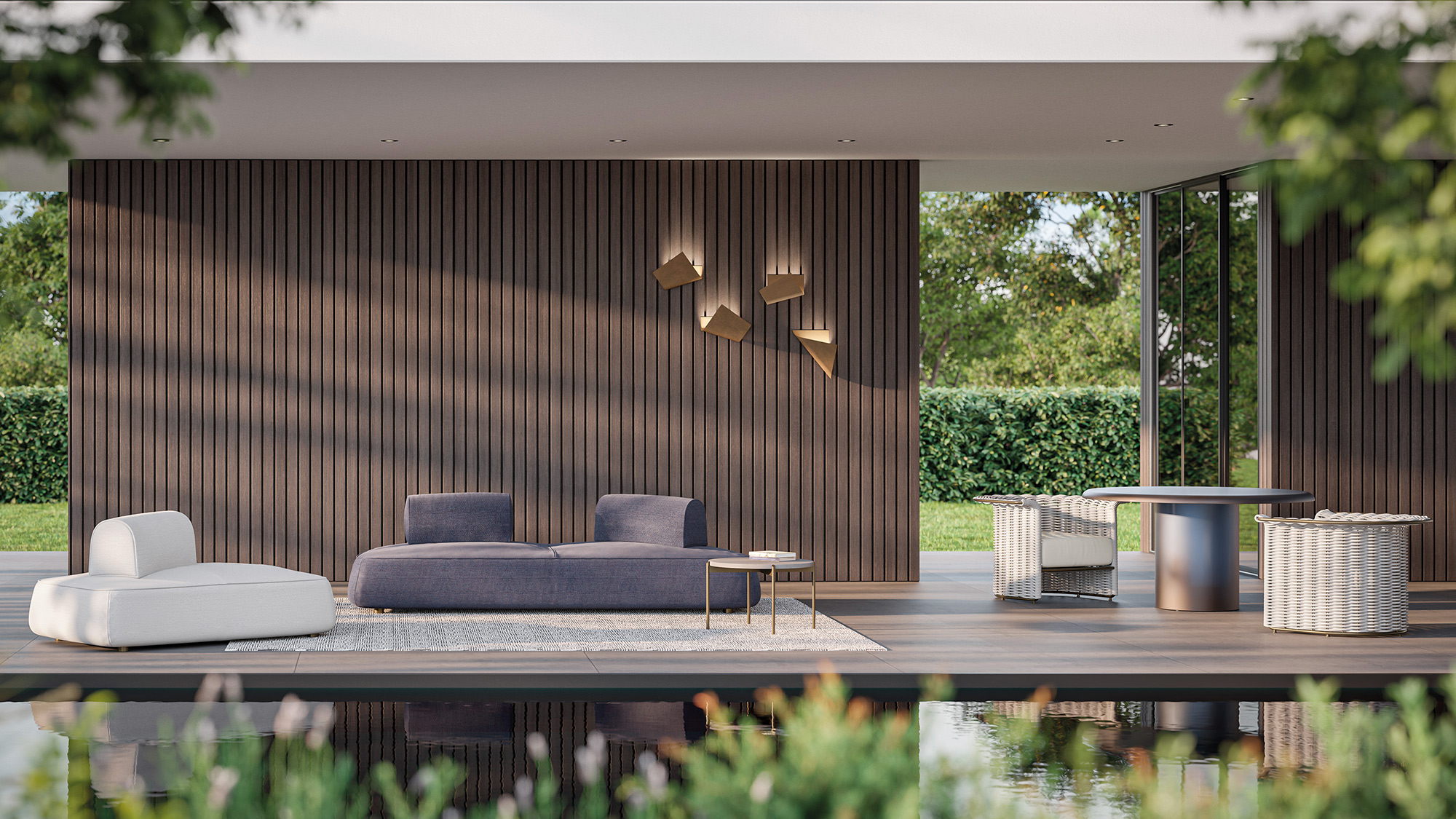 A technical finish with a neutral, enveloping tone, designed to offer a solid and uniform color reminiscent of the natural purity of sand. Engineered to withstand outdoor elements, this finish provides a sleek, contemporary aesthetic, perfect for creating bright, welcoming, and refined outdoor living spaces.